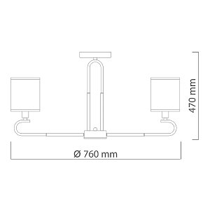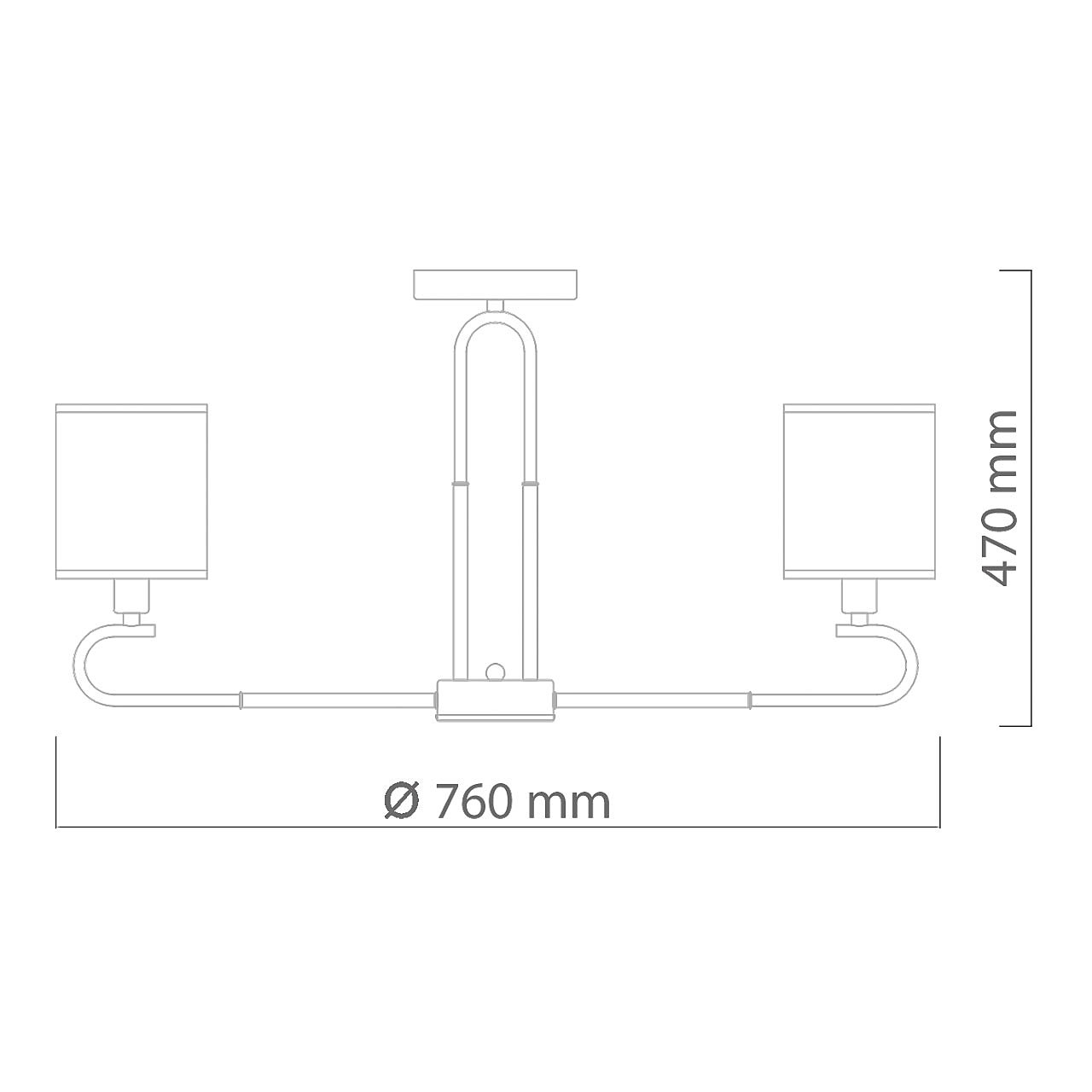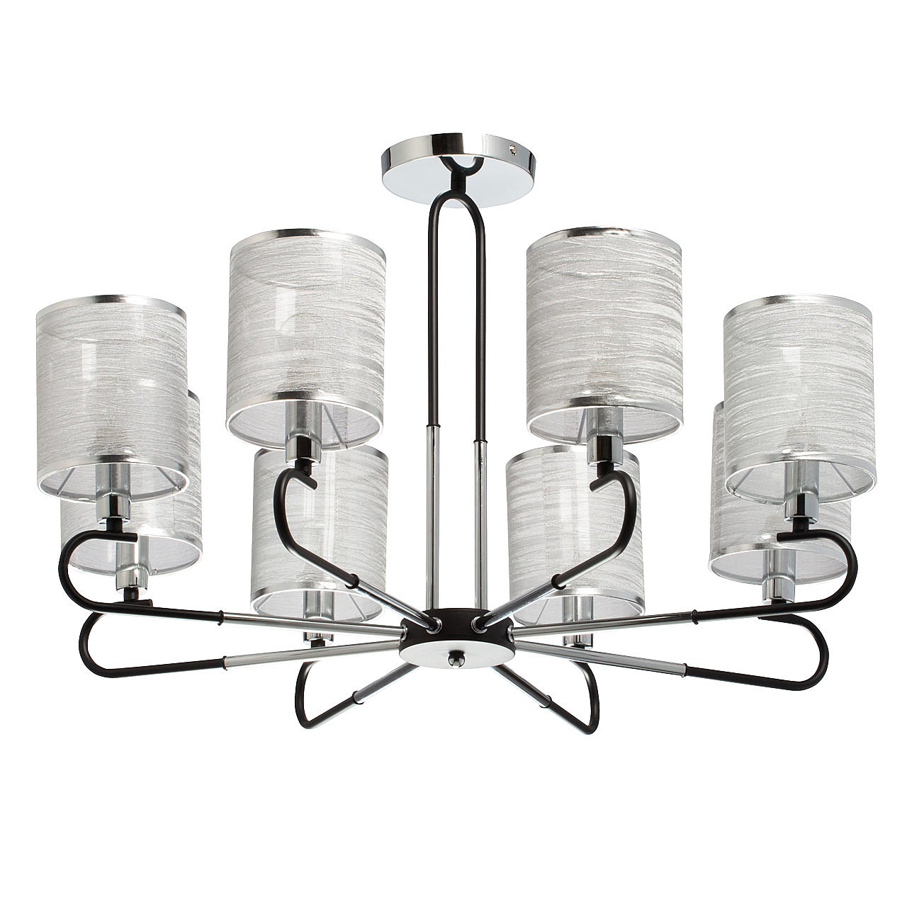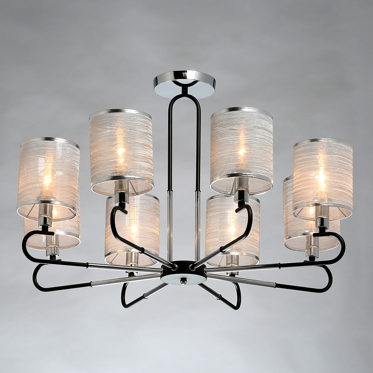 Основание светильника выполнено из металла и гальванизировано в цвет хрома. Отдельные элементы основания окрашены в черный цвет. Светильник декорирован двухслойными текстильными абажурами с термостойким акрилом внутри и жатой органзой серебряного цвета снаружи. Абажуры отделаны кантом серебряного цвета и прошиты.