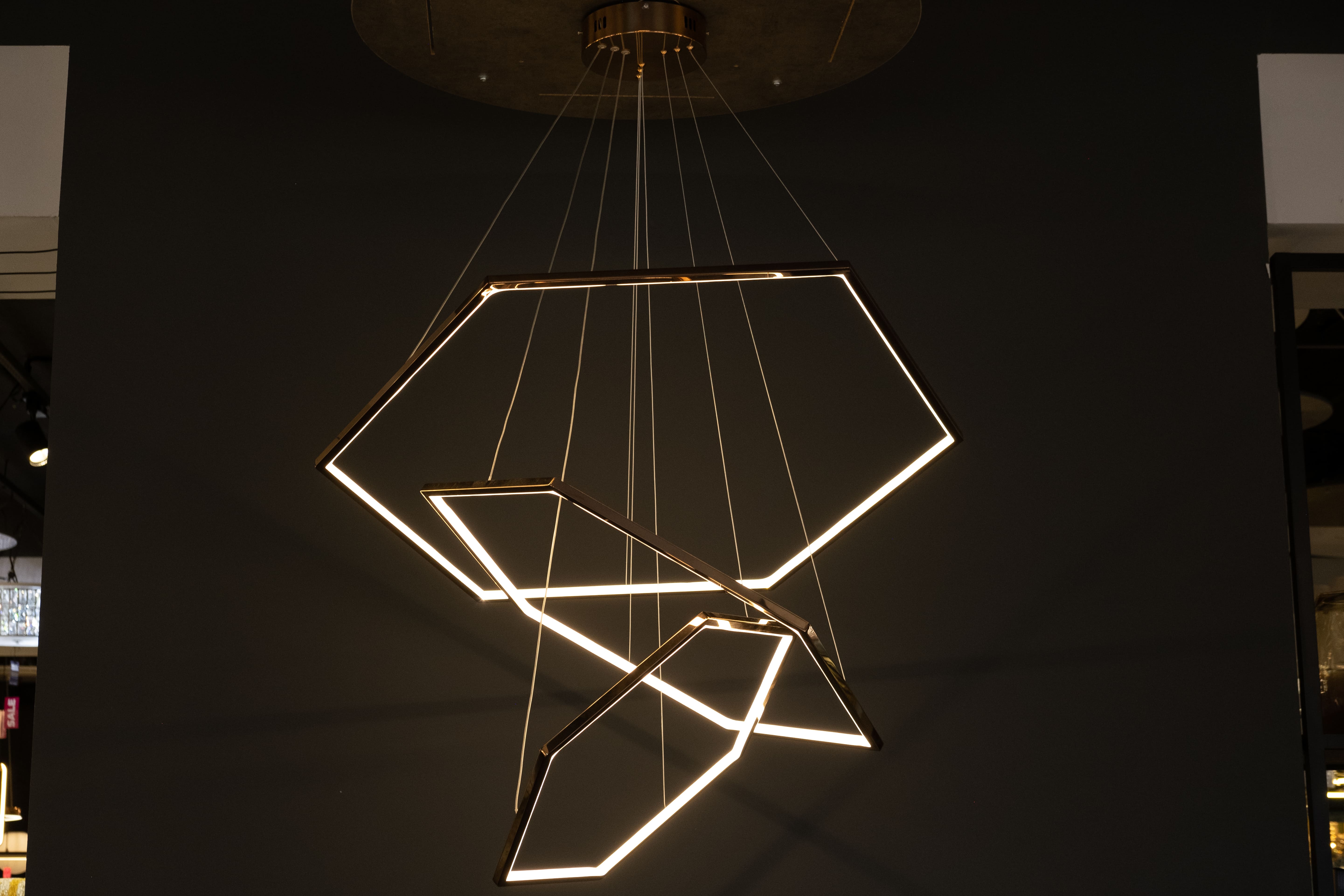 Эта люстра — трансформер. Можно соединить три модели разных диаметров в одну конструкцию. Либо разместить их поодиночке.