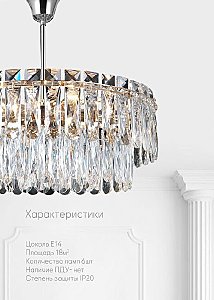 Допускается отличие страны-изготовителя, указанной в характеристиках. Линии производства могут находиться в нескольких государствах. Это не влияет на качество изготовления товара: все заводы данного бренда работают по общим стандартам, а готовые изделия проходят соответствующий контроль.Испания Коллекция Kristin ЦветЦвет арматуры Хром Цвет Хром Материал арматуры Металл Цвет декора прозрачный Материал декора Хрусталь РазмерыВысота (мм) 390 Длина (мм) 480 Диаметр (мм) 480 Высота минимальная (мм) 390 Ширина (мм) 480 ЭлектрикаКоличество ламп (шт) 6 Цоколь E14 Тип лампы Светодиодная, Накаливания, Энергосберегающая (КЛЛ) Лампочки в комплекте Нет в комплекте Мощность лампы (Вт) 40 Площадь освещения 18 Дополнительная информацияСтепень защиты (IP) IP20 Вес (Кг) 7,75 Тип подвеса На цепи -