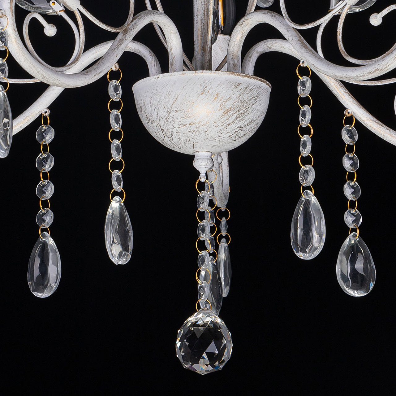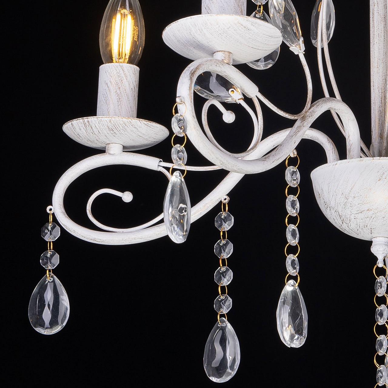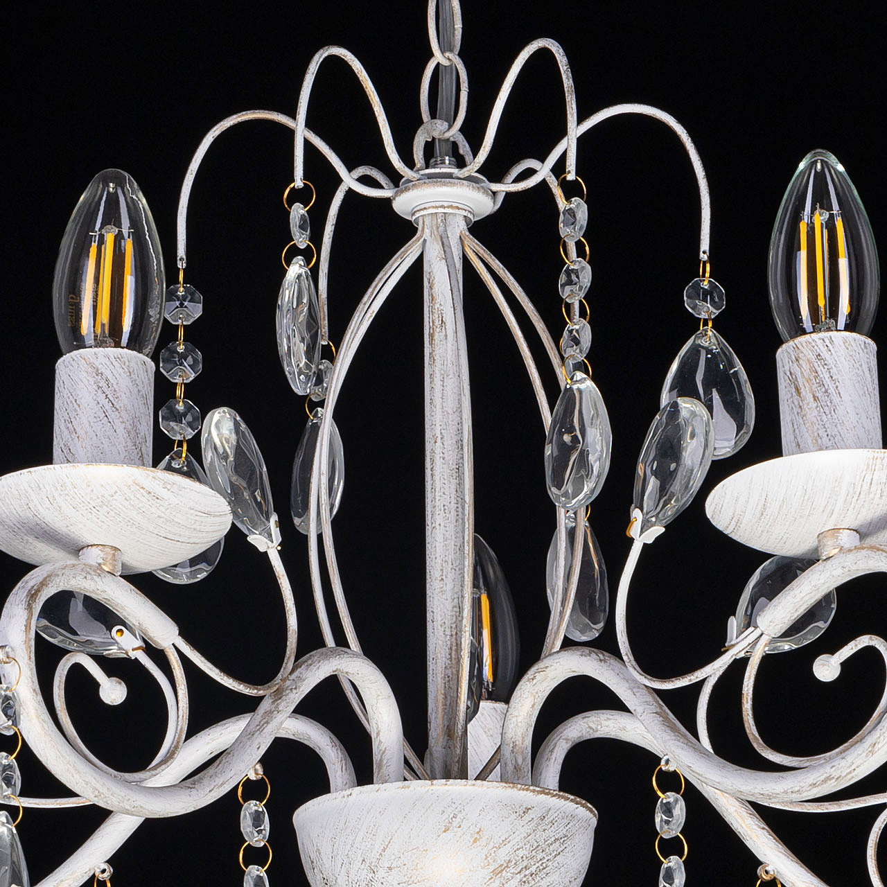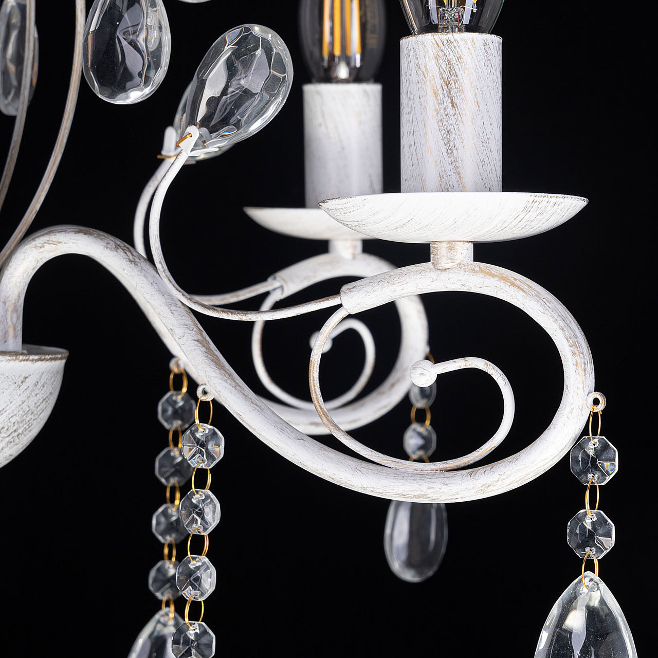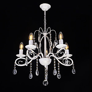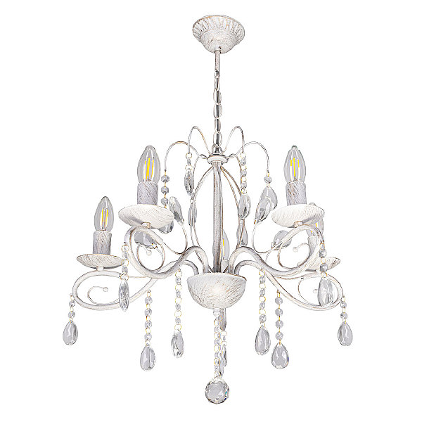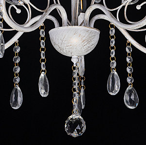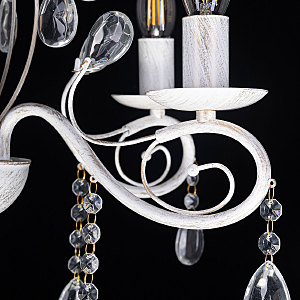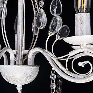 Классический дизайн подвесной люстры остается актуальным. Белый цвет основания с золотой патиной позволяет декорировать любой интерьер. Открытые источники света хорошо освещают все пространство комнаты. Заменяемые лампы удобны в эксплуатации.