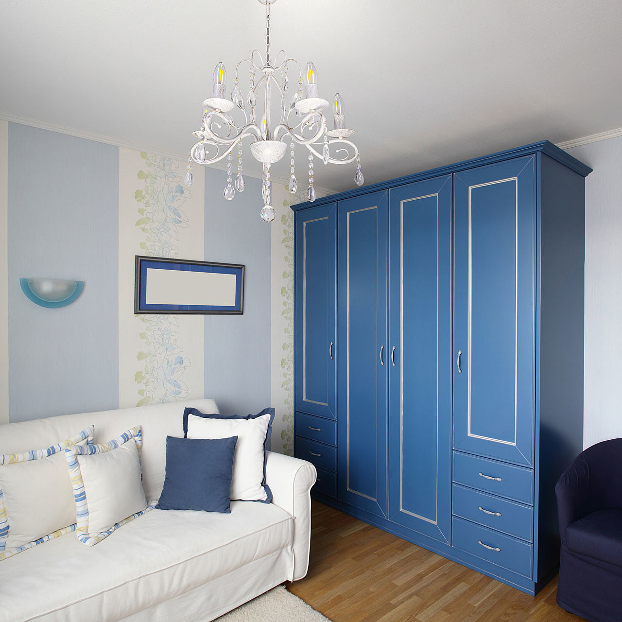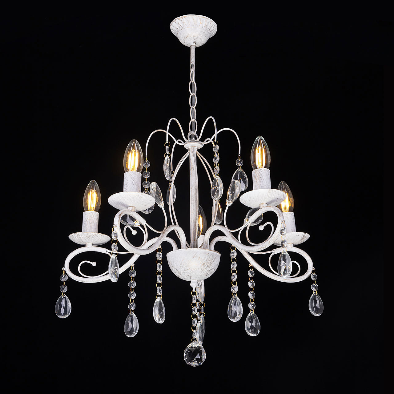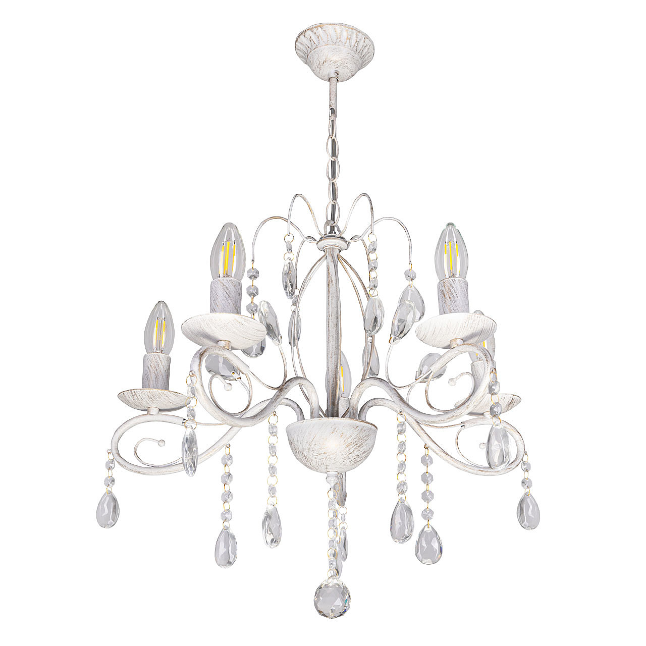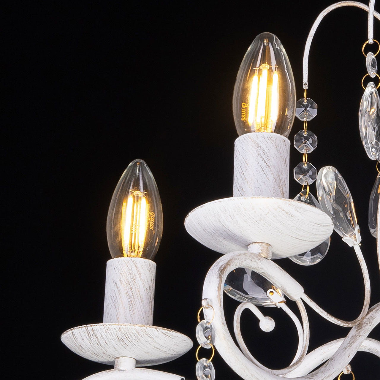 Классический дизайн подвесной люстры остается актуальным. Белый цвет основания с золотой патиной позволяет декорировать любой интерьер. Открытые источники света хорошо освещают все пространство комнаты. Заменяемые лампы удобны в эксплуатации.