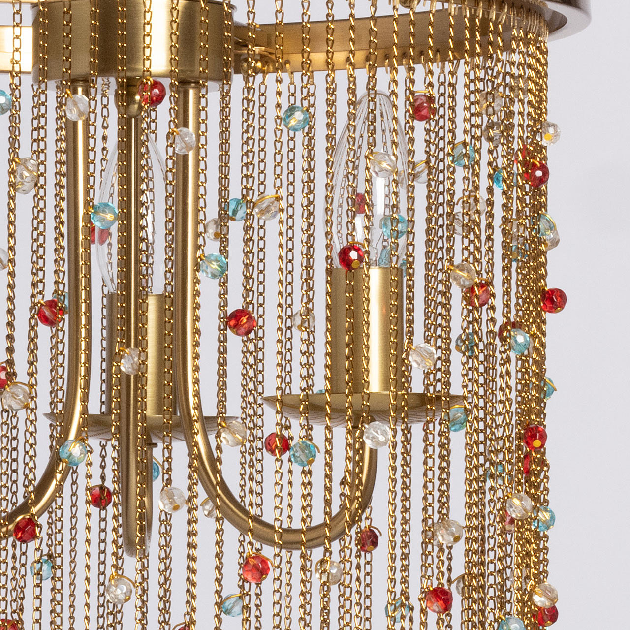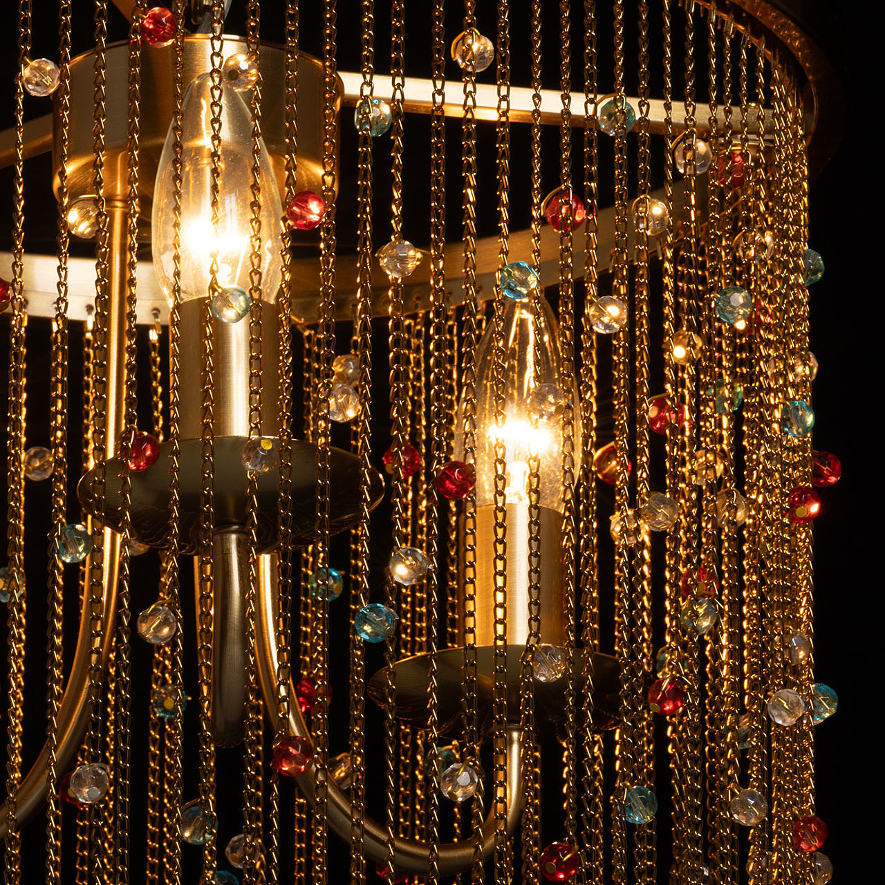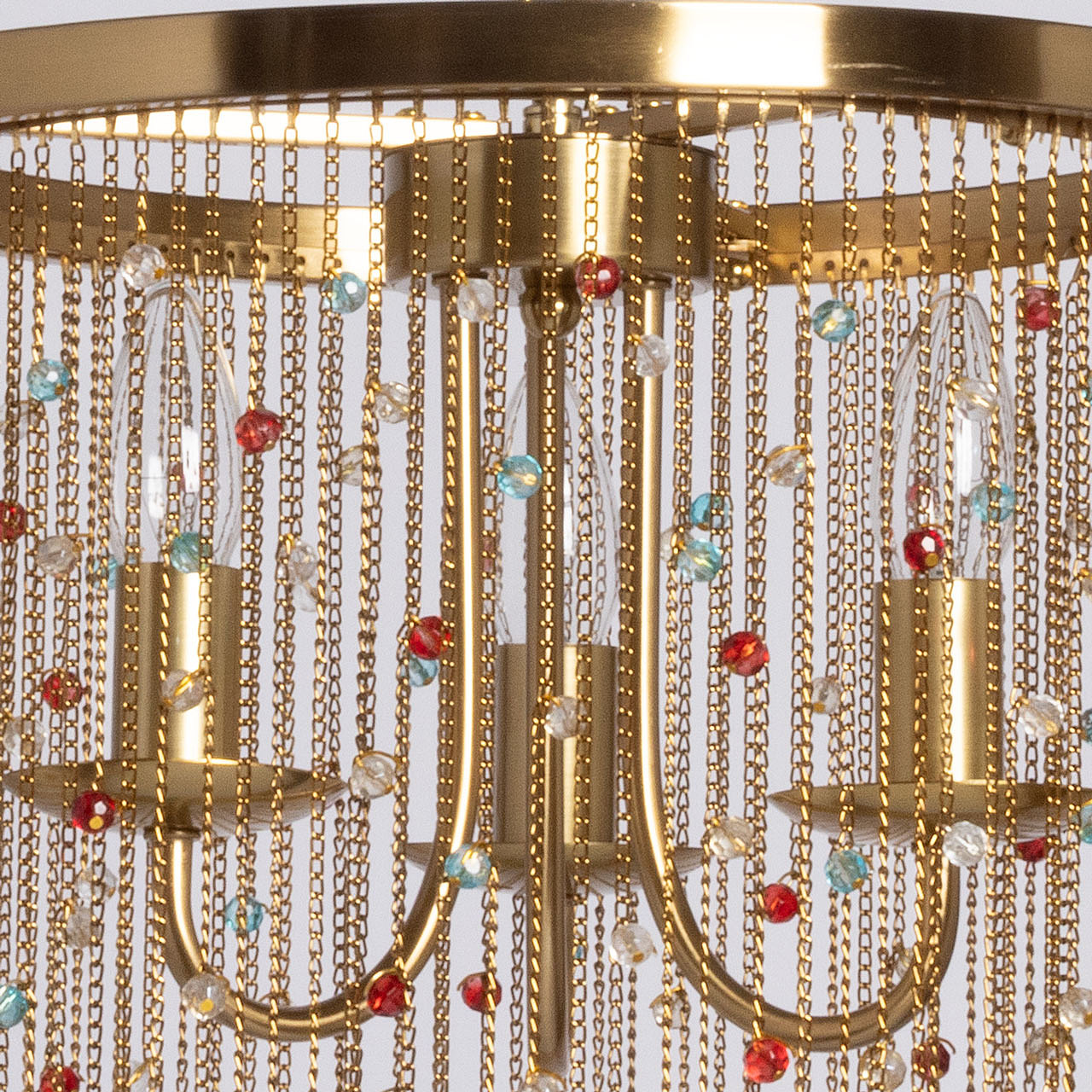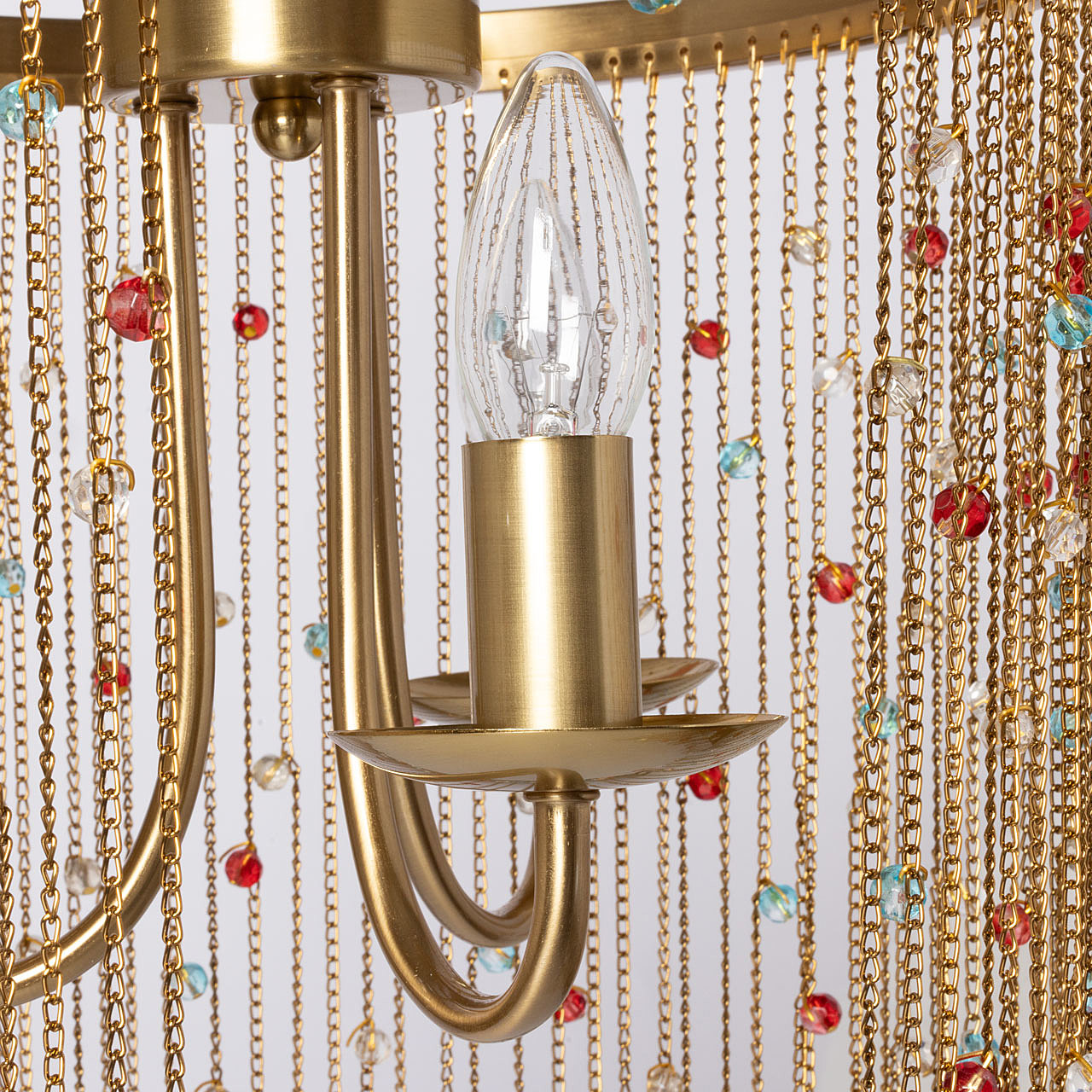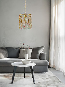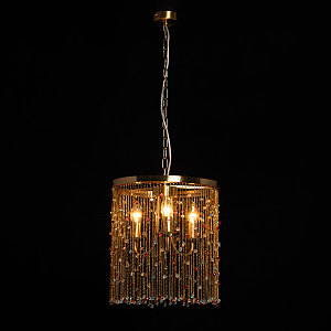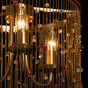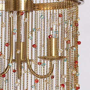 Гальваника в цвет латуни придает люстре благородный вид. Парадный и яркий образ создают разноцветные хрустальные бусины. Заменяемые источники света удобны в эксплуатации. Возможность регулировать комфортную высоту.