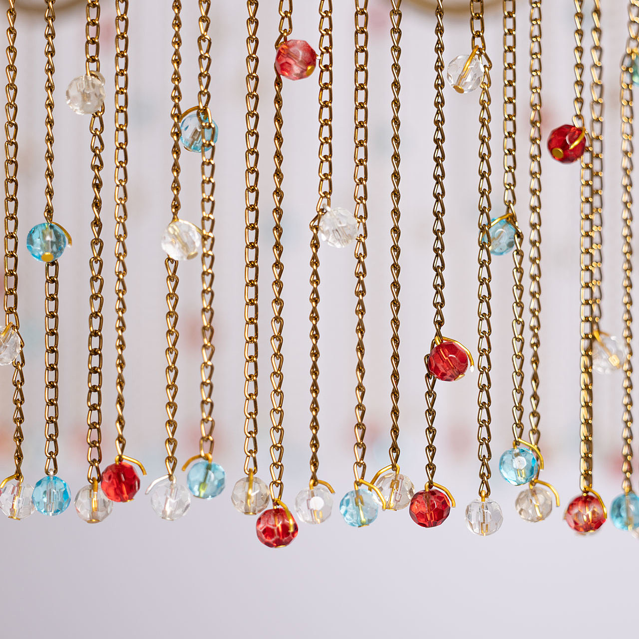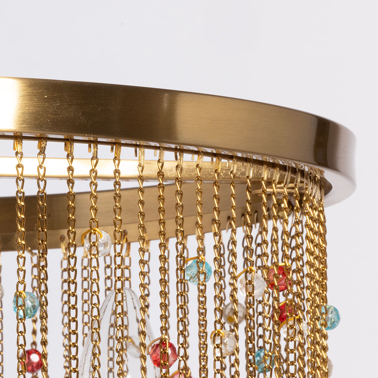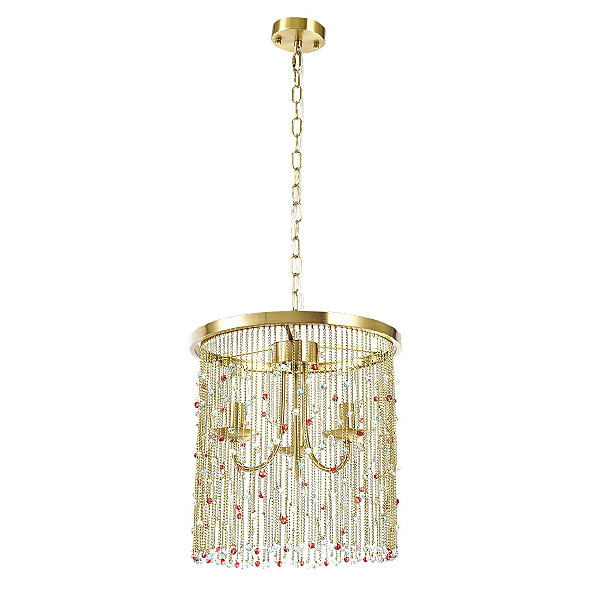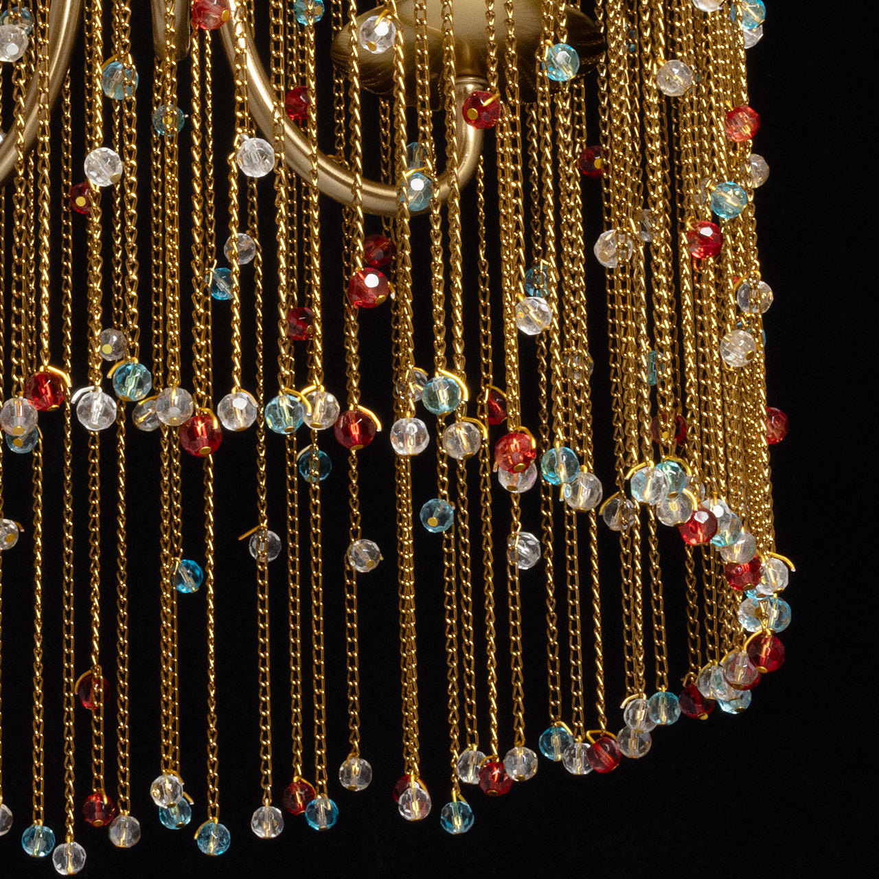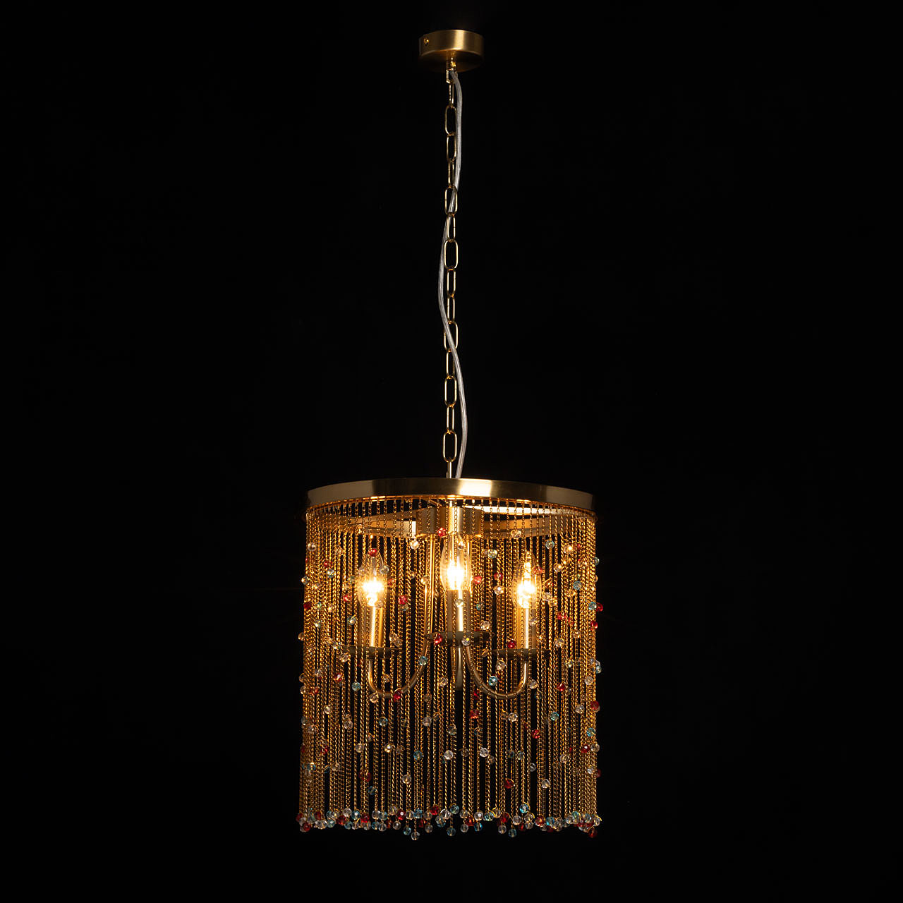 Гальваника в цвет латуни придает люстре благородный вид. Парадный и яркий образ создают разноцветные хрустальные бусины. Заменяемые источники света удобны в эксплуатации. Возможность регулировать комфортную высоту.