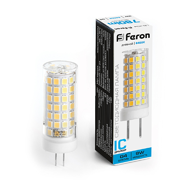 Лампа светодиодная FERON LB-434, JCD (капсульная), 9W 230V G4 6400К (дневной), рассеиватель прозрачный 780Lm, угол рассеивания 270градусов, 63*18мм