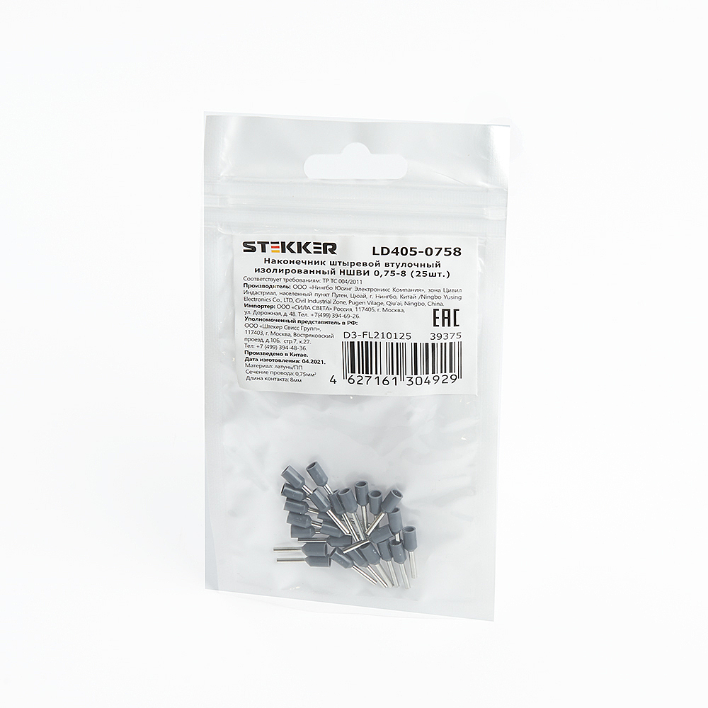 Наконечник Штыревой Втулочный Изолированный STEKKER; 0,75 - 8 мм-; , латунь, полипропилен (PP), серый