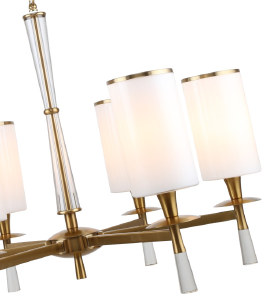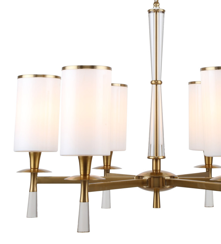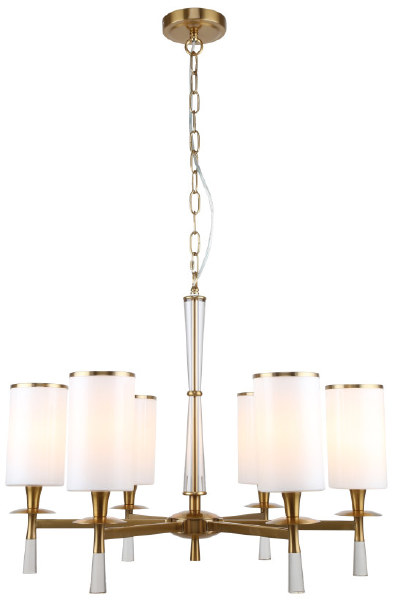 Люстра подвесная из коллекции Leader выполнена из металла, гальванизированного в цвет бронзы, и декорирована плафонами из белого матового стекла с железным кантом, гальванизированным в цвет арматуры.
