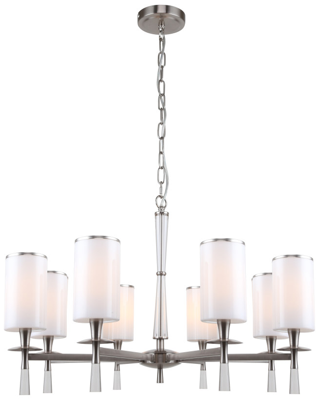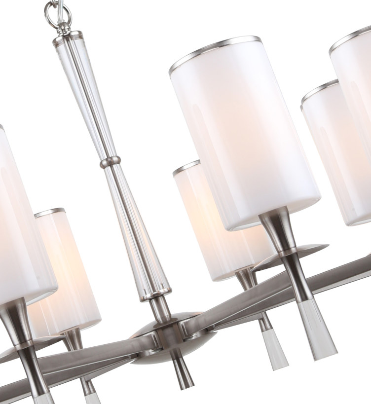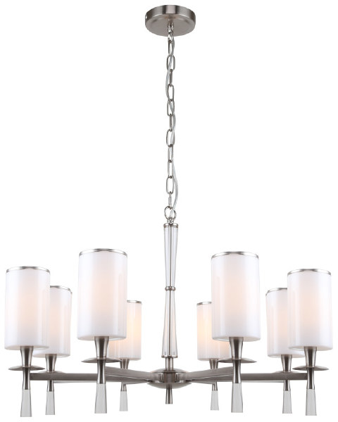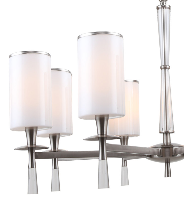 Люстра подвесная из коллекции Leader выполнена из металла, гальванизированного в цвет никель, и декорирована плафонами из белого матового стекла с железным кантом, гальванизированным в цвет арматуры.