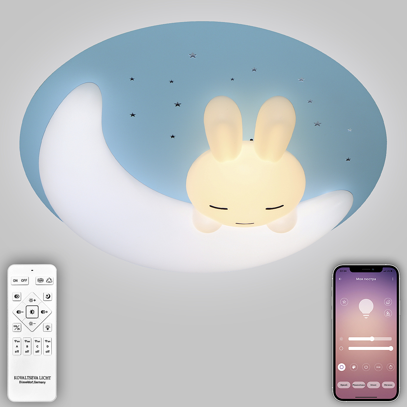 Высококачественный LED светильник в современном стиле с функционалом "умный дом". Данная люстра сочетает в себе исключительный дизайн и обширную функциональность. Люстра имеет интересный дизайн, который представляет собой зайца с луной на сине-голубом фоне. На основании имеются звёзды с доп. внутренней подсветкой. Многофункциональный пульт управления позволит дистанционно управлять светильником. Возможность управлять светильником со смартфона и планшета, загрузив специальное приложение. Люстра имеет тёплый, естественный и холодный свет с регулировкой температуры свечения. Кроме того, имеется функция регулировки яркости свечения, делая светильник оптимальным в процессе использования. Имеет режим ночника и таймер отключения. Общая мощность лампы 100 Ватт. Потолочный светодиодный светильник может осветить до 22 метров2. Он прост в сборке, установке и экономичен в обслуживании. Подойдёт для всех видов потолков. Степень защиты 20 IP. Светодиодные ленты и платы легко заменимы в случае перегорания. Цветовая температура от 2700 до 7000Kelvin(K). Состав: Металл, Акрил, пластик. Световой поток 7200 lm.