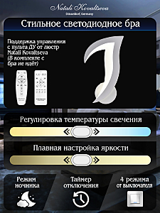 Светодиодный светильник с дистанционным управлением через смартфон, планшет. Дизайн бра выполнен в современном стиле в белом цвете и отлично подойдёт в любой интерьер, а акрил обеспечит отличное рассеивание света. Люстра имеет тёплый, естественный и холодный свет с регулировкой температуры свечения. Обладает плавной настройкой яркости в диапазоне от 10% до 100%. Имеется режим ночника и таймер отключения. Кроме того, от стандартного выключателя бра имеет 4 режима свечения. Возможно подключение радиочастотного пульта ДУ от светодиодных люстр Natali Kovaltseva. Данные функции делают светильник оптимальным в процессе использования. Общая мощность 36W со световым потоком 2280 lm позволяет осветить до 5 кв.м. Он уже собран и прост в установке, экономичен в обслуживании. Светодиоды легко заменимы в случае перегорания. Есть возможность установить на потолок или на поверхность под наклоном. Цветовая температура настраивается от 2700 до 7000 K. Степень защиты 20 IP.