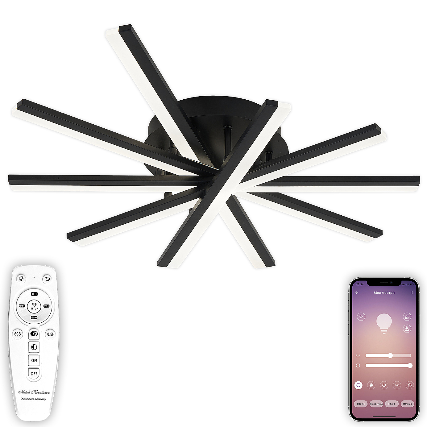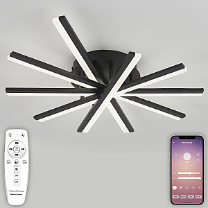 Светодиодный светильник с дистанционным управлением через пульт ДУ, смартфон, планшет с функцией памяти. Лицевую часть составляют равноудалённые друг от друга прямые направляющие, расположенные ступенчато. По их периметру расположена подсветка, акрил обеспечивает отличное рассеивание света. Дизайн люстры выполнен в современном стиле в чёрном цвете и отлично подойдёт в любой интерьер. Люстра имеет тёплый, естественный и холодный свет с регулировкой температуры свечения от 3000 до 6500 K. Обладает плавной настройкой яркости в диапазоне от 10% до 100%. Имеется режим ночника и таймер отключения. От стандартного выключателя люстра имеет 4 режима свечения. Данные функции делают светильник оптимальным в процессе использования. Общая мощность 100W позволяет осветить до 22 кв.м. Он прост в сборке, установке и экономичен в обслуживании. Люстра подойдёт для всех видов потолков. Степень защиты 20 IP.