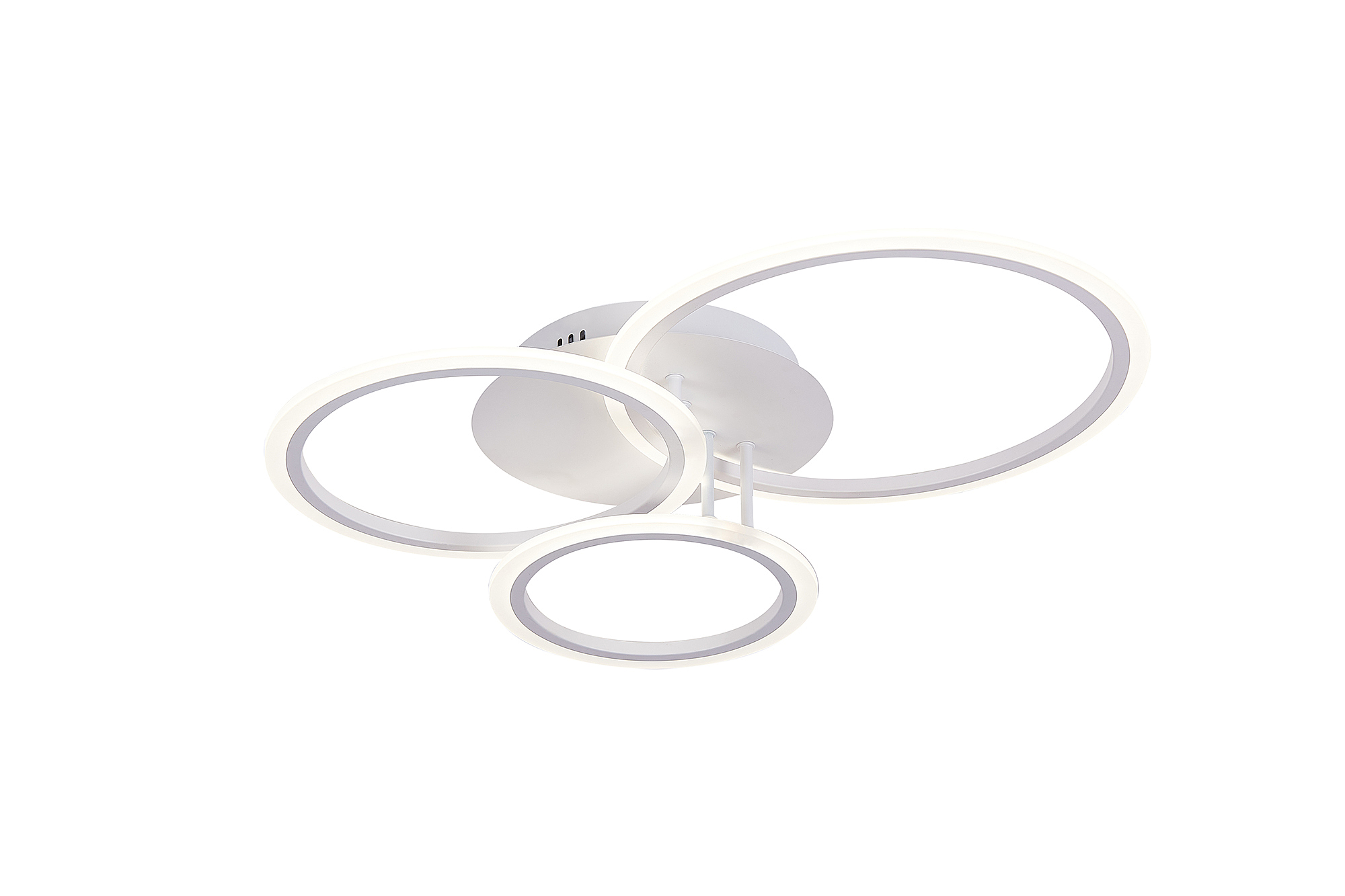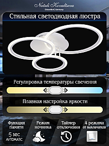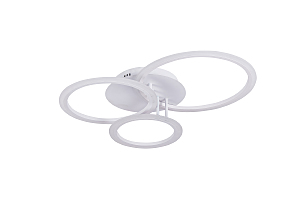 Светодиодный светильник с дистанционным управлением через пульт ДУ, смартфон, планшет с функцией памяти. Лицевую часть составляют три округлых элемента разного диаметра и расположенных на разной высоте. По их периметру расположена подсветка, акрил обеспечивает отличное рассеивание света. Дизайн люстры выполнен в современном стиле в белом цвете и отлично подойдёт в любой интерьер. Люстра имеет тёплый, естественный и холодный свет с регулировкой температуры свечения от 3000 до 6500 K. Обладает плавной настройкой яркости в диапазоне от 10% до 100%. Имеется режим ночника и таймер отключения. От стандартного выключателя люстра имеет 4 режима свечения. Данные функции делают светильник оптимальным в процессе использования. Общая мощность 100W позволяет осветить до 18 кв.м. Он прост в сборке, установке и экономичен в обслуживании. Люстра подойдёт для всех видов потолков. Степень защиты 20 IP.