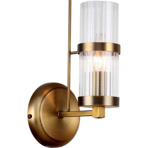 Светильник настенный из коллекции Legion выполнен из металла, гальванизированного в цвет бронзы, и декорирован вытянутым плафоном из прозрачного фактурного стекла линейной текстуры.