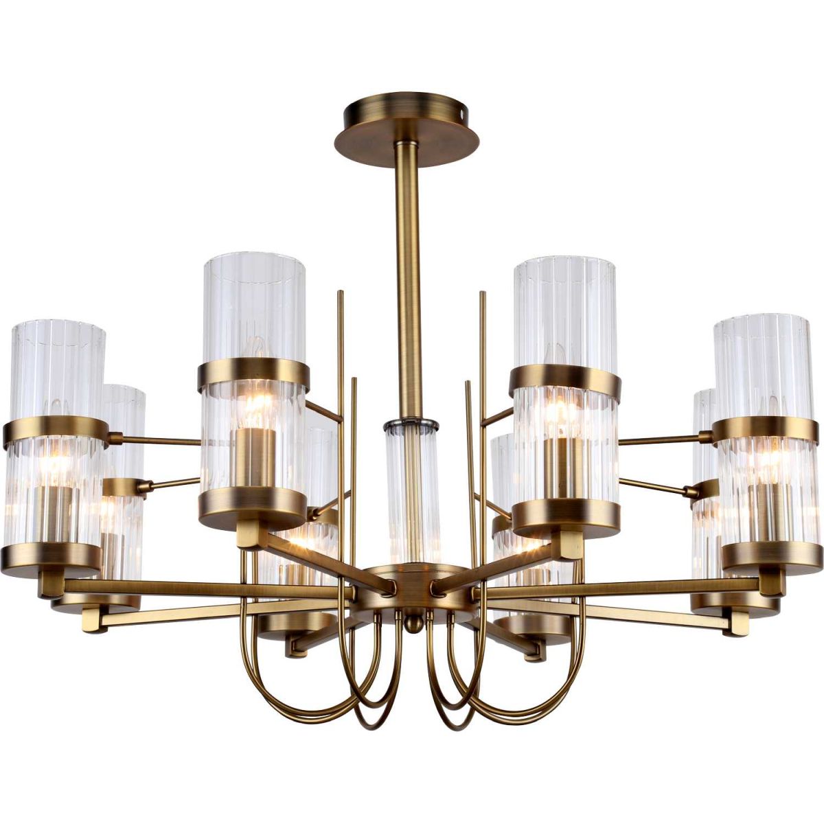 Люстра потолочная на штанге из коллекции Legion выполнена из металла, гальванизированного в цвет бронзы, и декорирована вытянутыми плафонами из прозрачного фактурного стекла линейной текстуры.