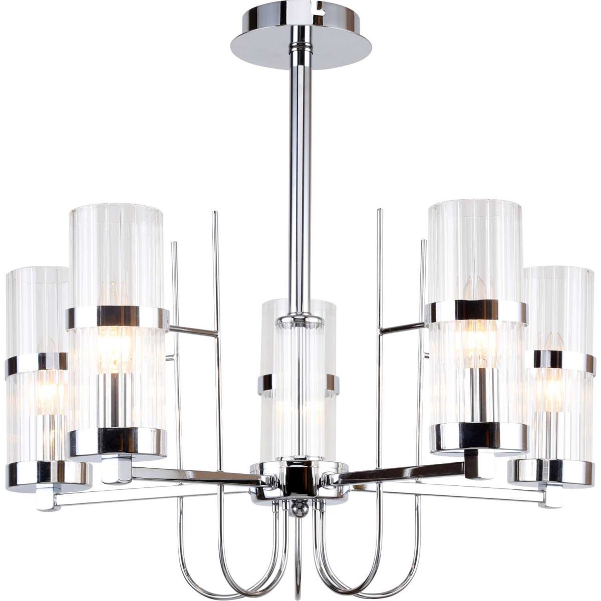 Люстра потолочная на штанге из коллекции Legion выполнена из металла, гальванизированного в цвет хрома, и декорирована вытянутыми плафонами из прозрачного фактурного стекла линейной текстуры.