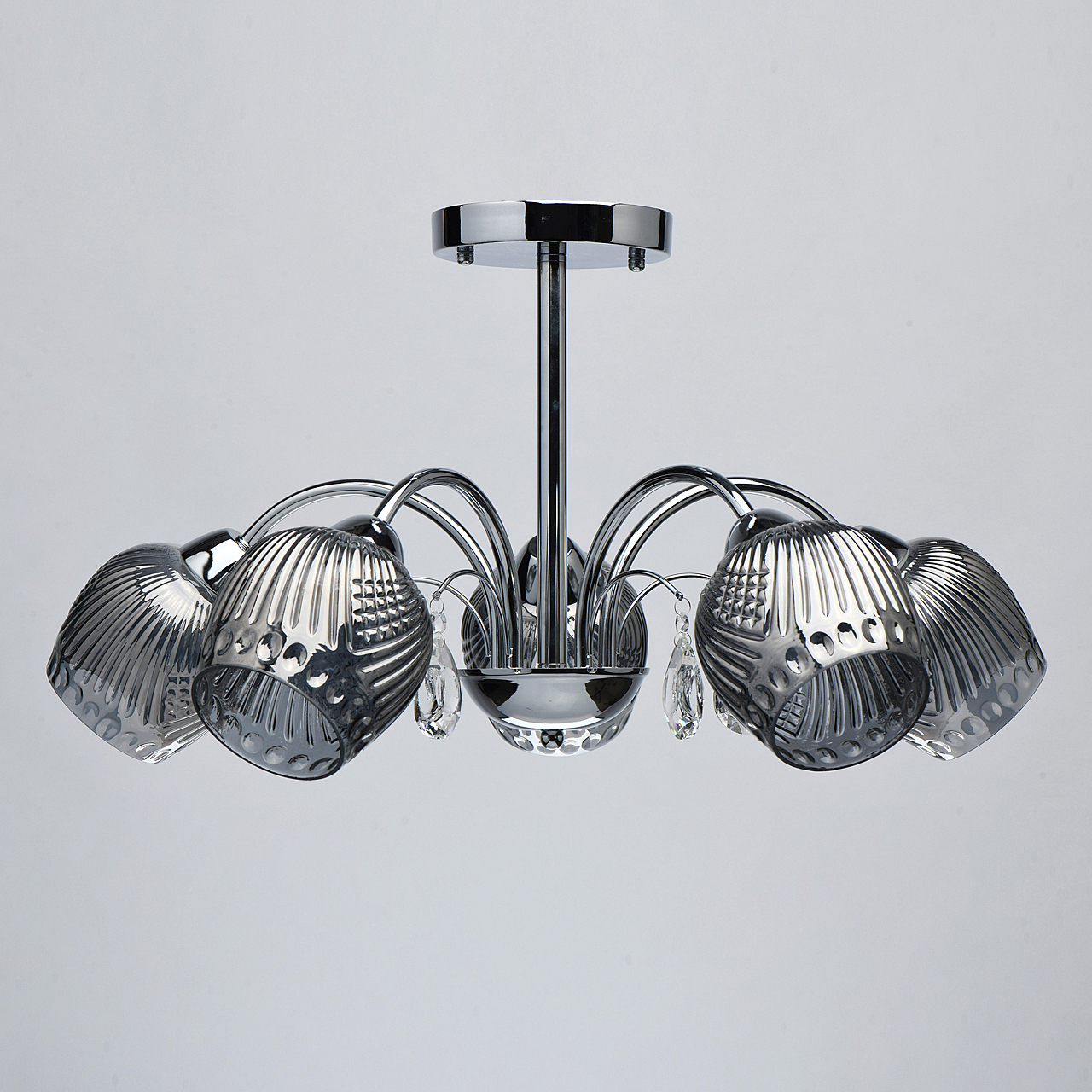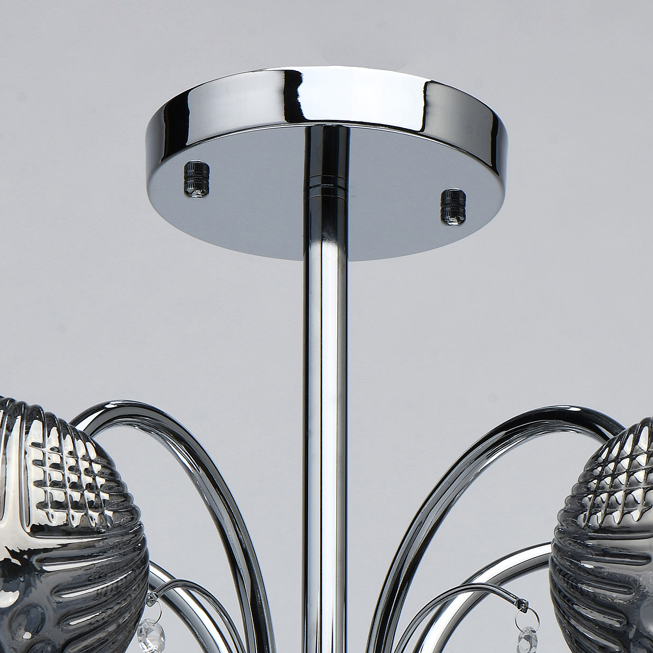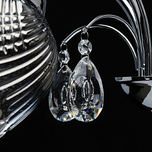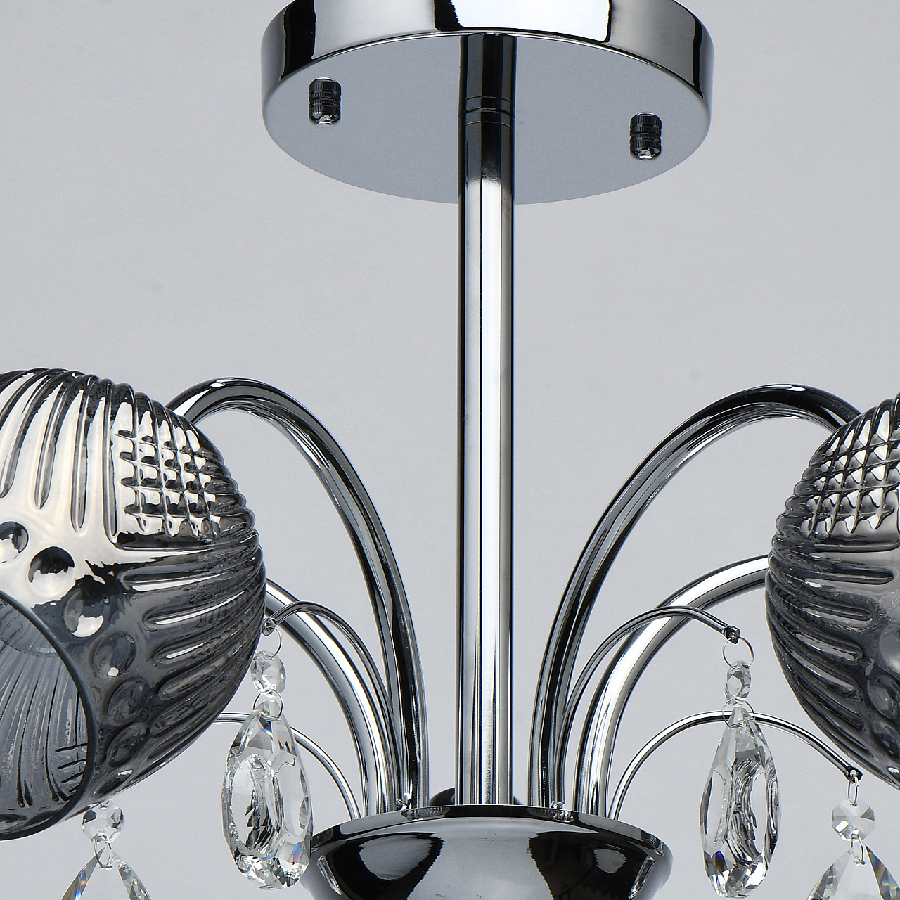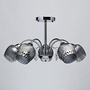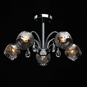 Оригинальная модель в универсальном цвете хрома.Декор из прозрачного хрусталя создает игру света.Рельефные плафоны из стекла гальванизированы в дымчатый цвет, создают комфортное освещение. Компактная высота для стандартных помещений.