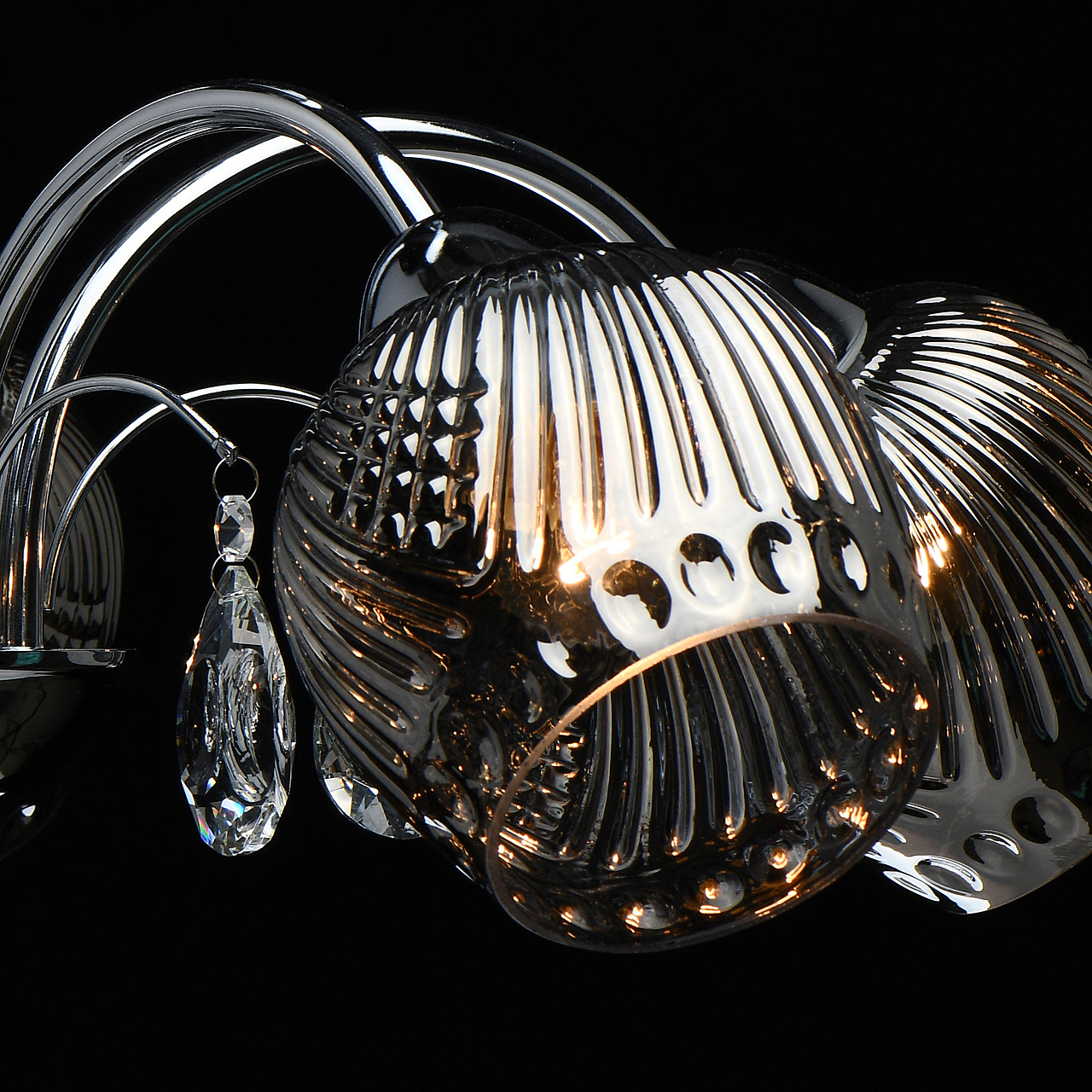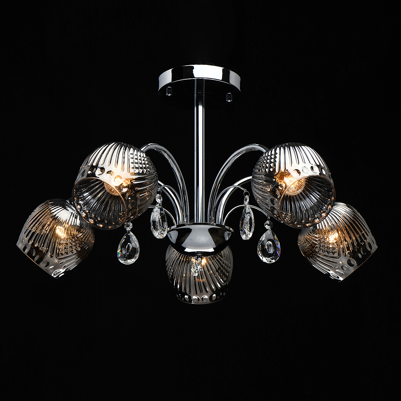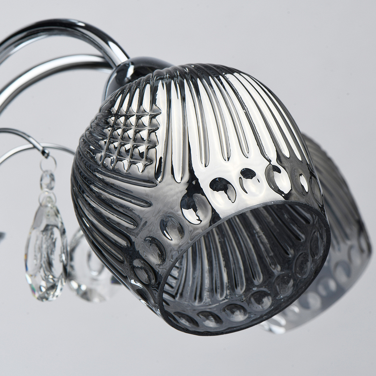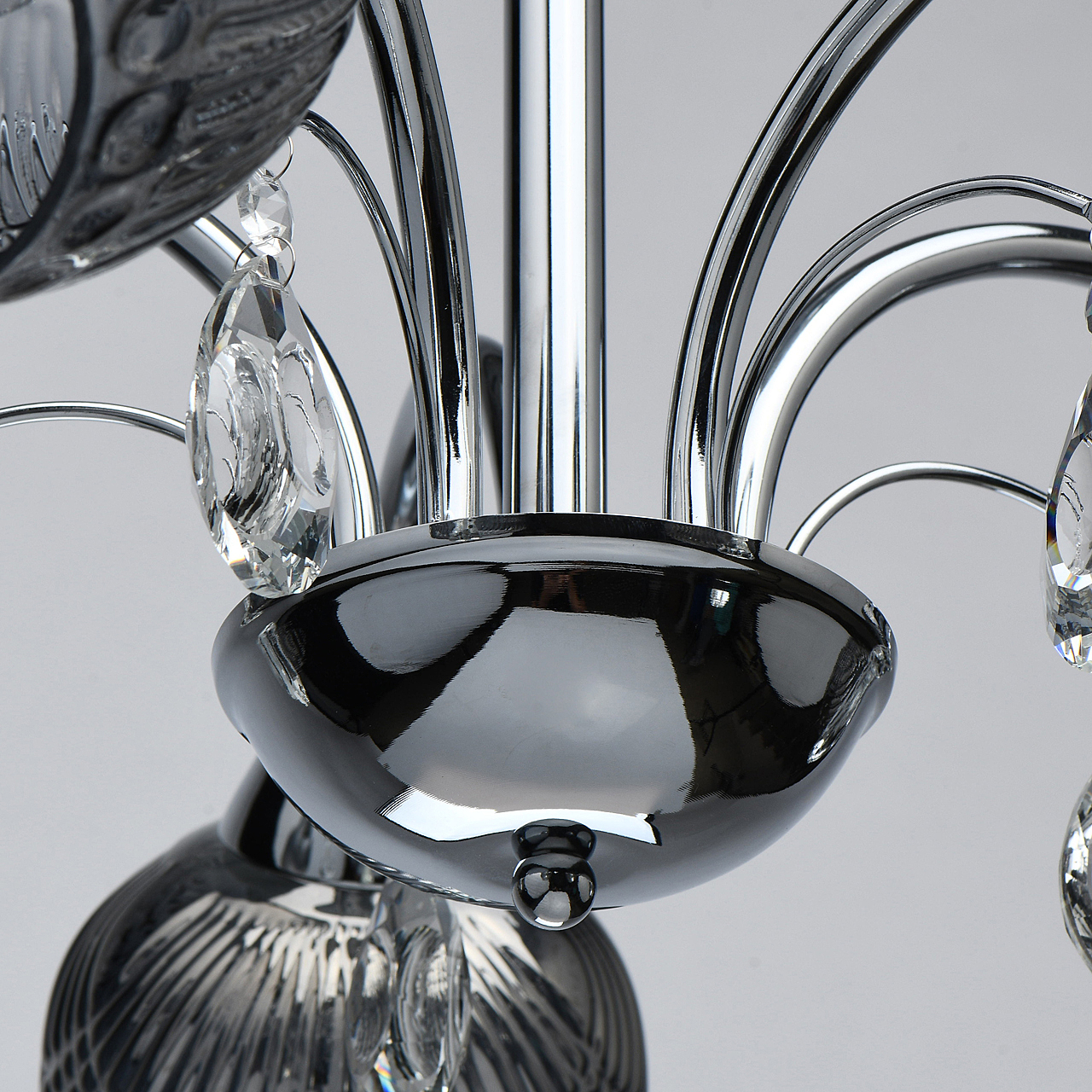 Оригинальная модель в универсальном цвете хрома.Декор из прозрачного хрусталя создает игру света.Рельефные плафоны из стекла гальванизированы в дымчатый цвет, создают комфортное освещение. Компактная высота для стандартных помещений.
