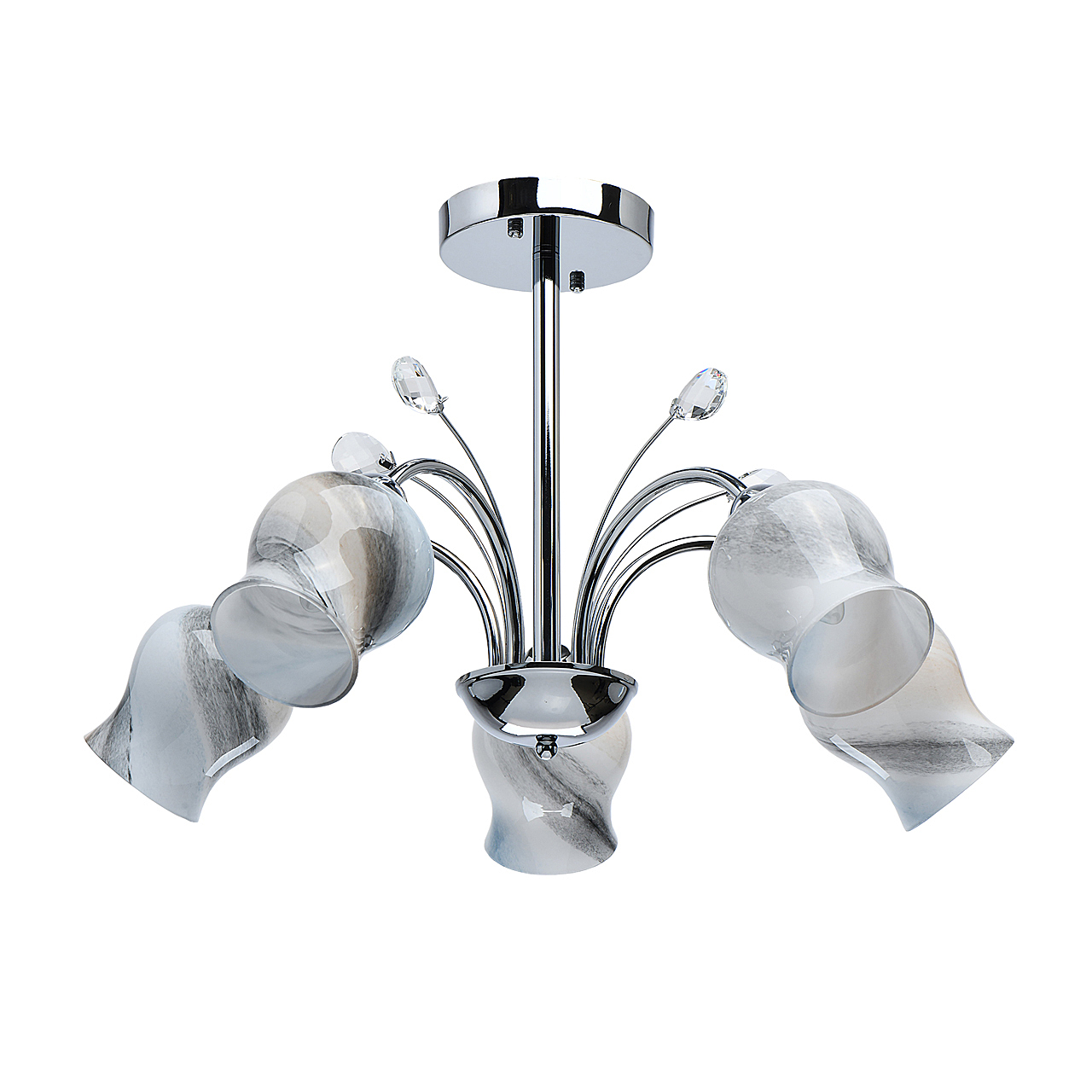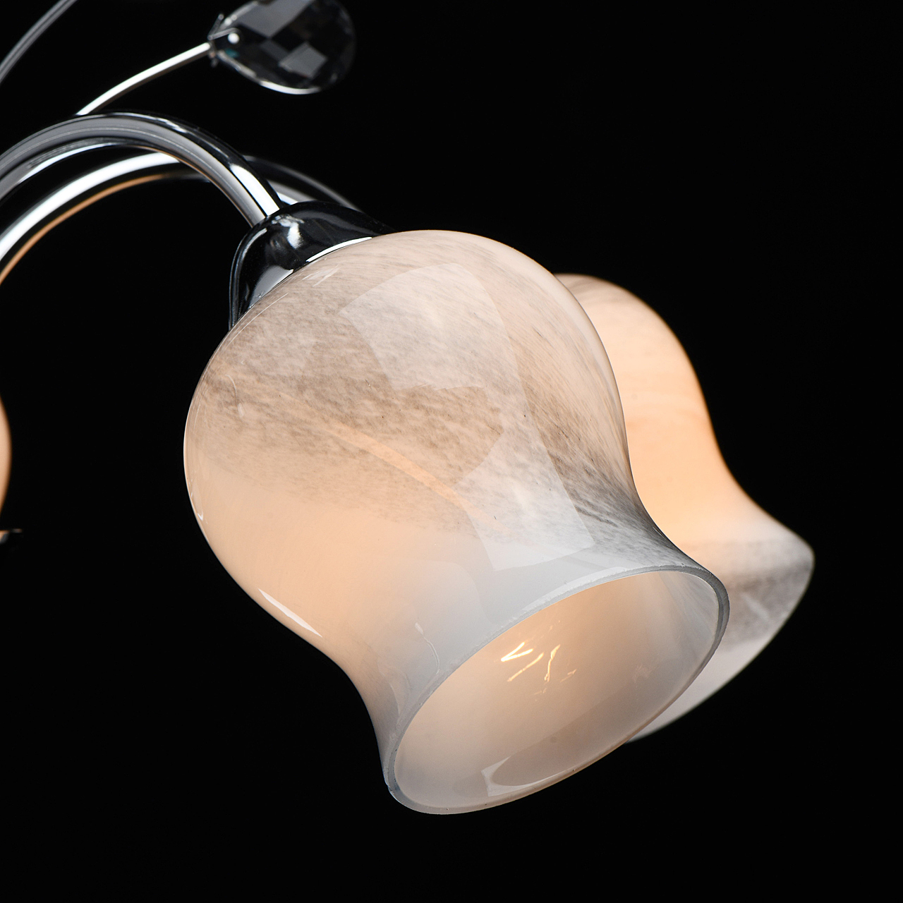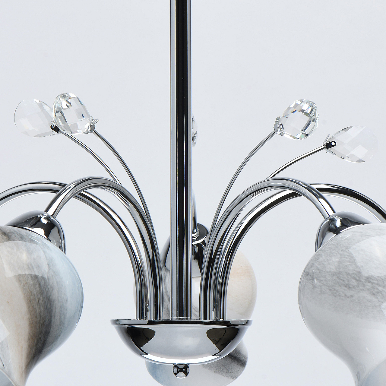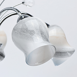 Дизайн в трендовых цветах современных интерьеров создает настроение.Уникальная расцветка каждого плафона.Декор из прозрачного хрусталя украшает люстру.Компактная высота светильника идеальна для стандартной высоты потолка. Заменяемые источники света удобны в эксплуатации.