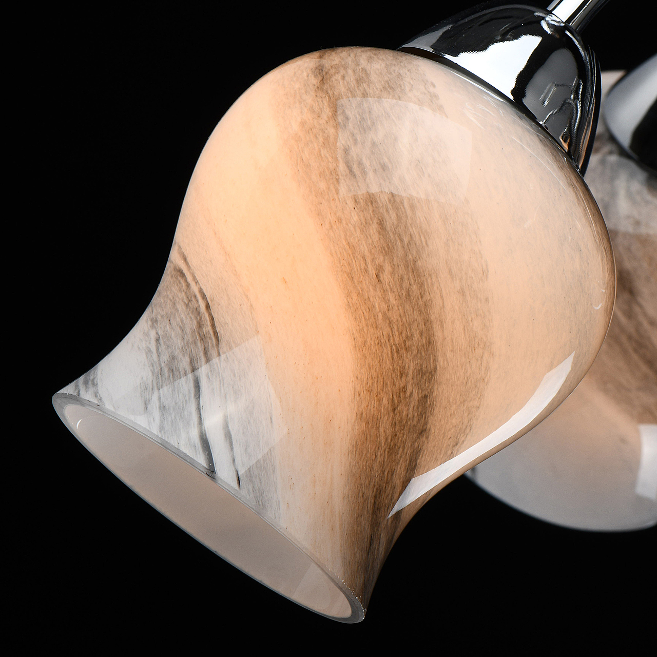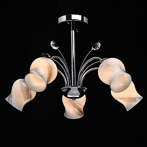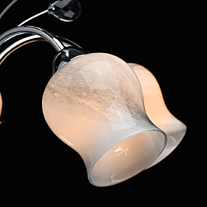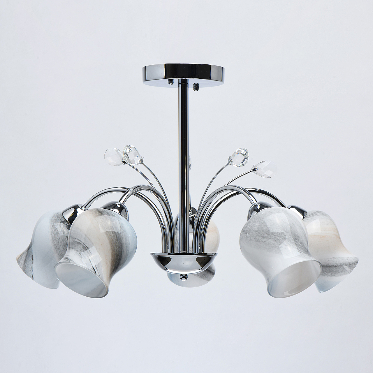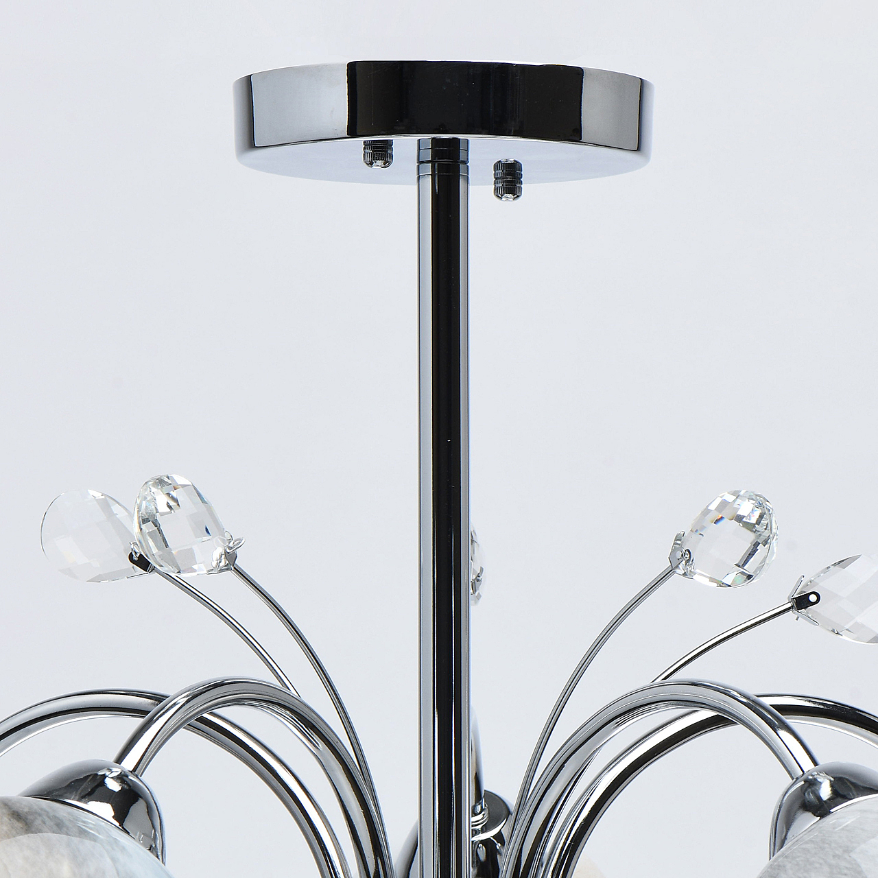 Дизайн в трендовых цветах современных интерьеров создает настроение.Уникальная расцветка каждого плафона.Декор из прозрачного хрусталя украшает люстру.Компактная высота светильника идеальна для стандартной высоты потолка. Заменяемые источники света удобны в эксплуатации.