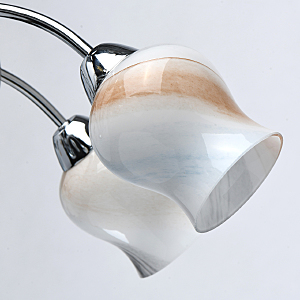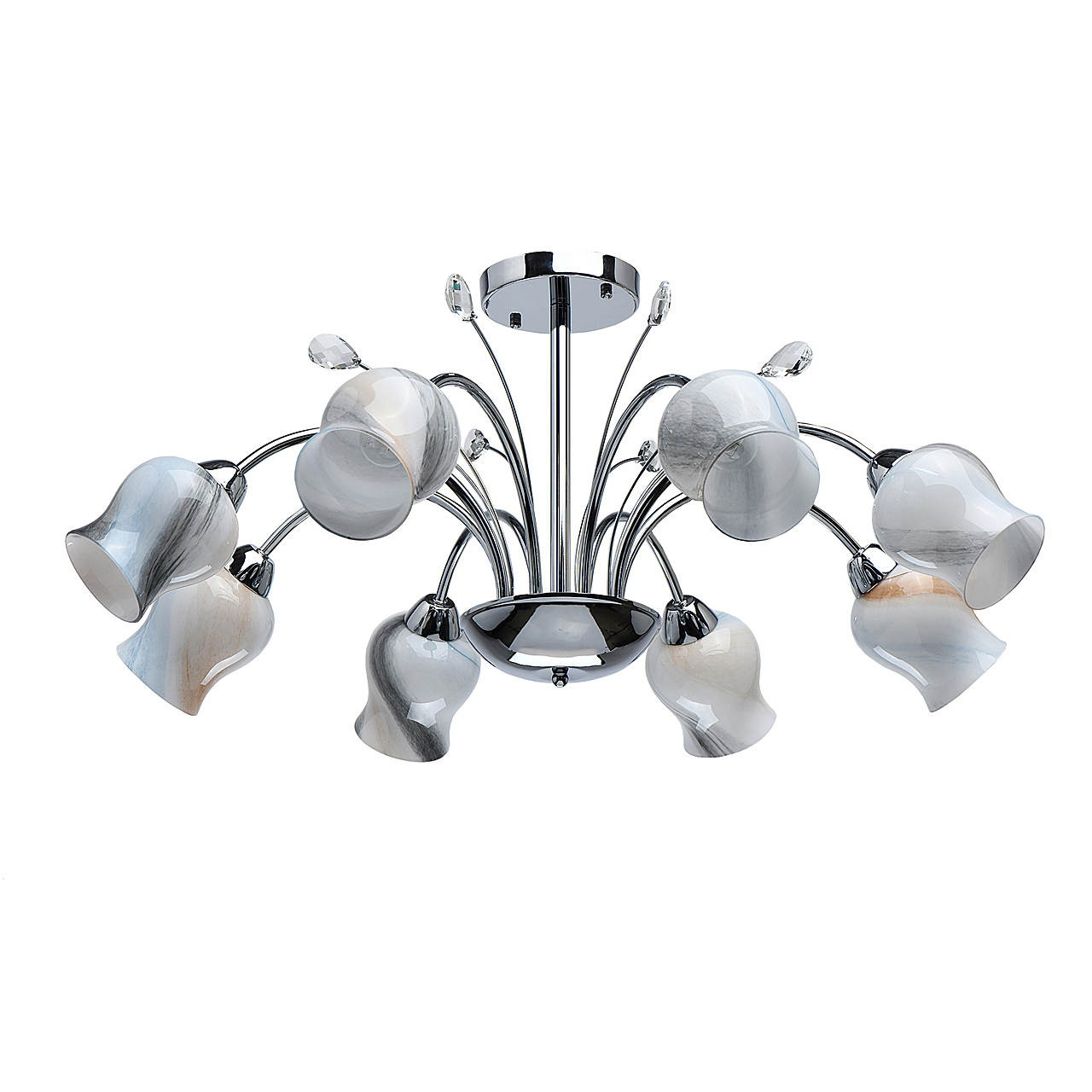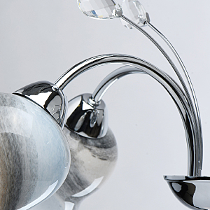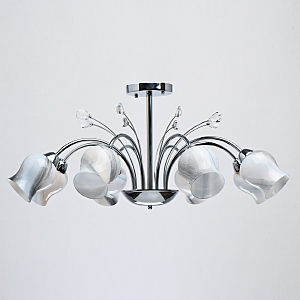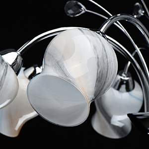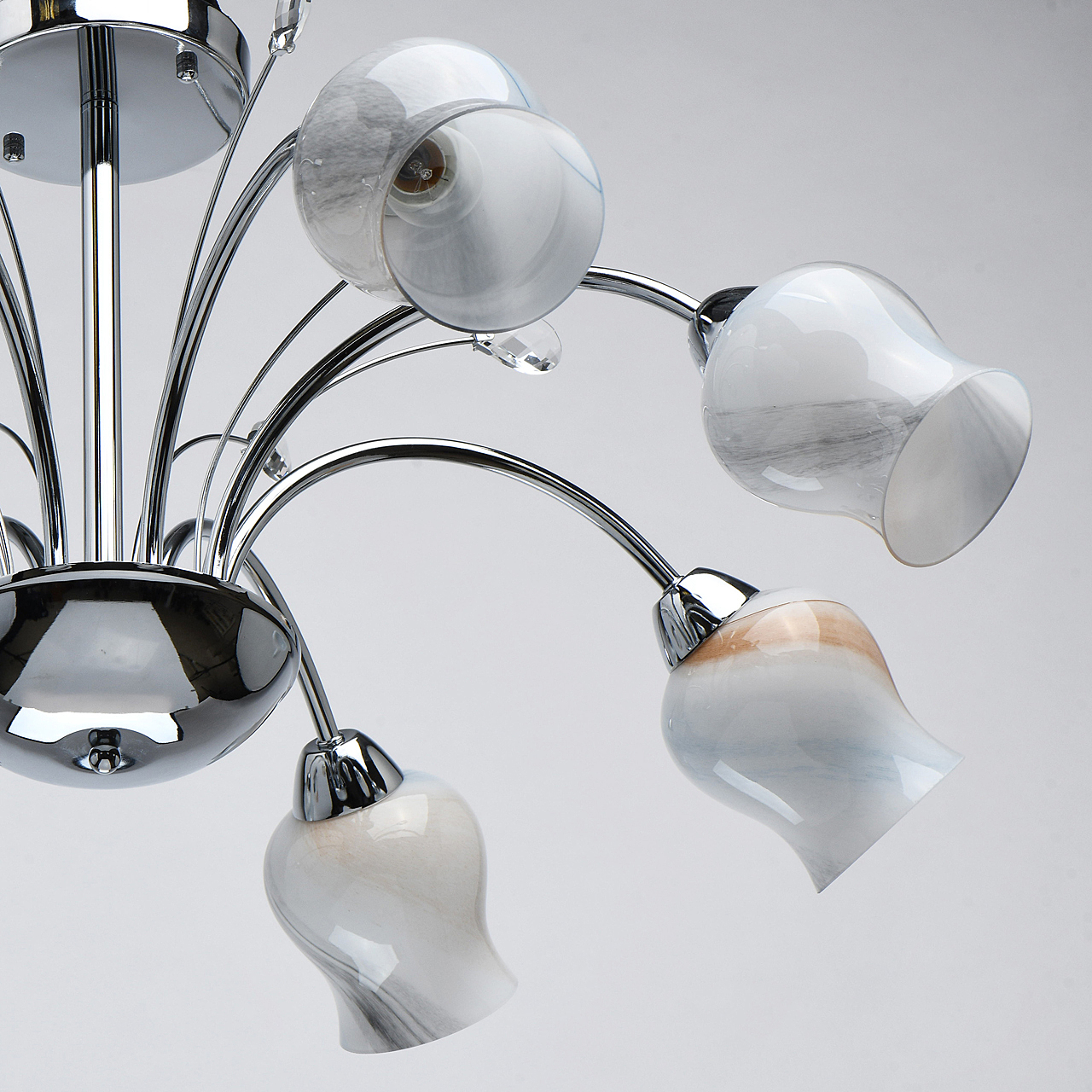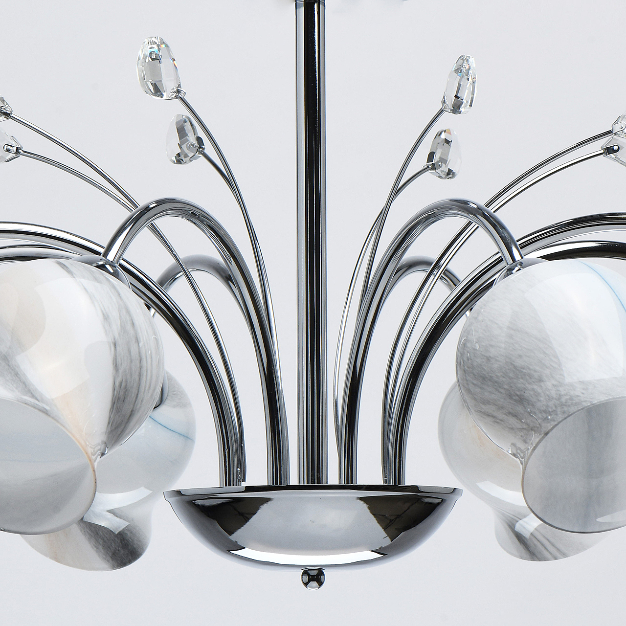 Дизайн в трендовых цветах современных интерьеров создает настроение.Уникальная расцветка каждого плафона.Декор из прозрачного хрусталя украшает люстру.Компактная высота светильника идеальна для стандартной высоты потолка. Широкий диаметр обеспечивает высокие параметры освещения.Заменяемые источники света удобны в эксплуатации.