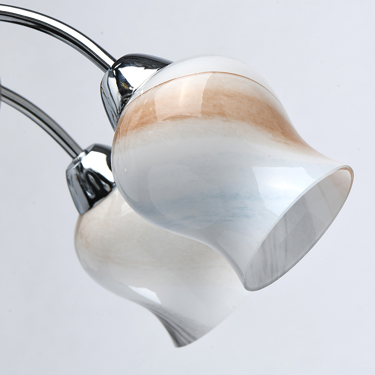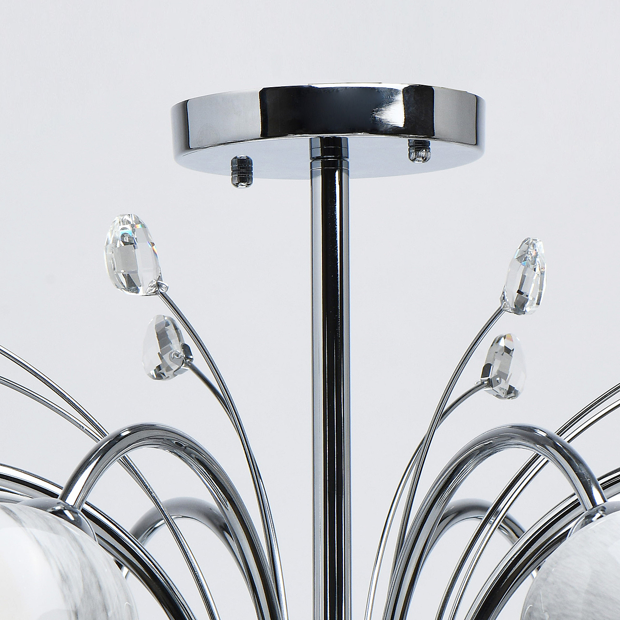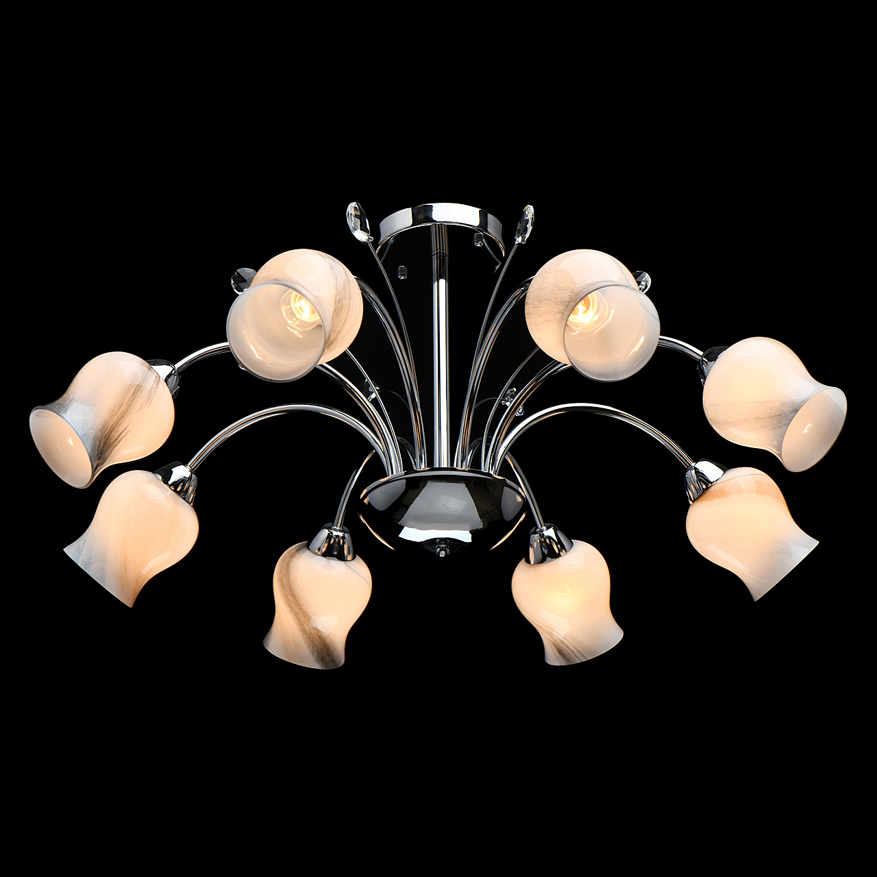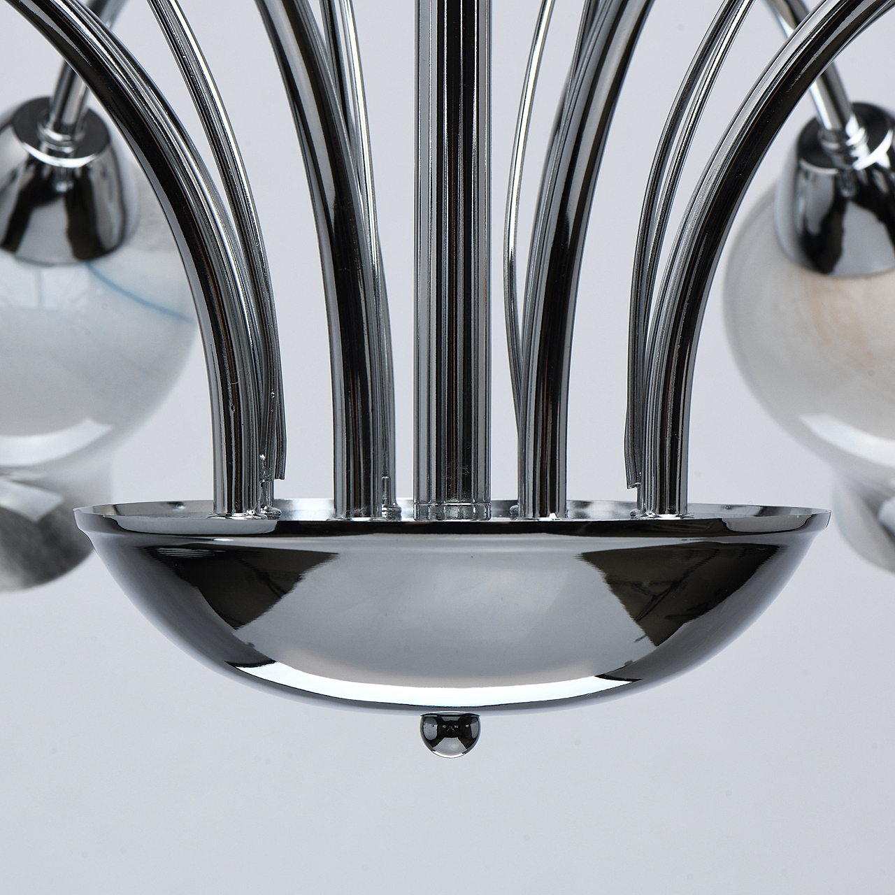 Дизайн в трендовых цветах современных интерьеров создает настроение.Уникальная расцветка каждого плафона.Декор из прозрачного хрусталя украшает люстру.Компактная высота светильника идеальна для стандартной высоты потолка. Широкий диаметр обеспечивает высокие параметры освещения.Заменяемые источники света удобны в эксплуатации.