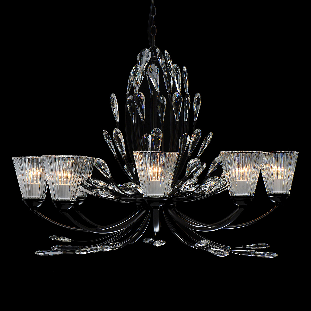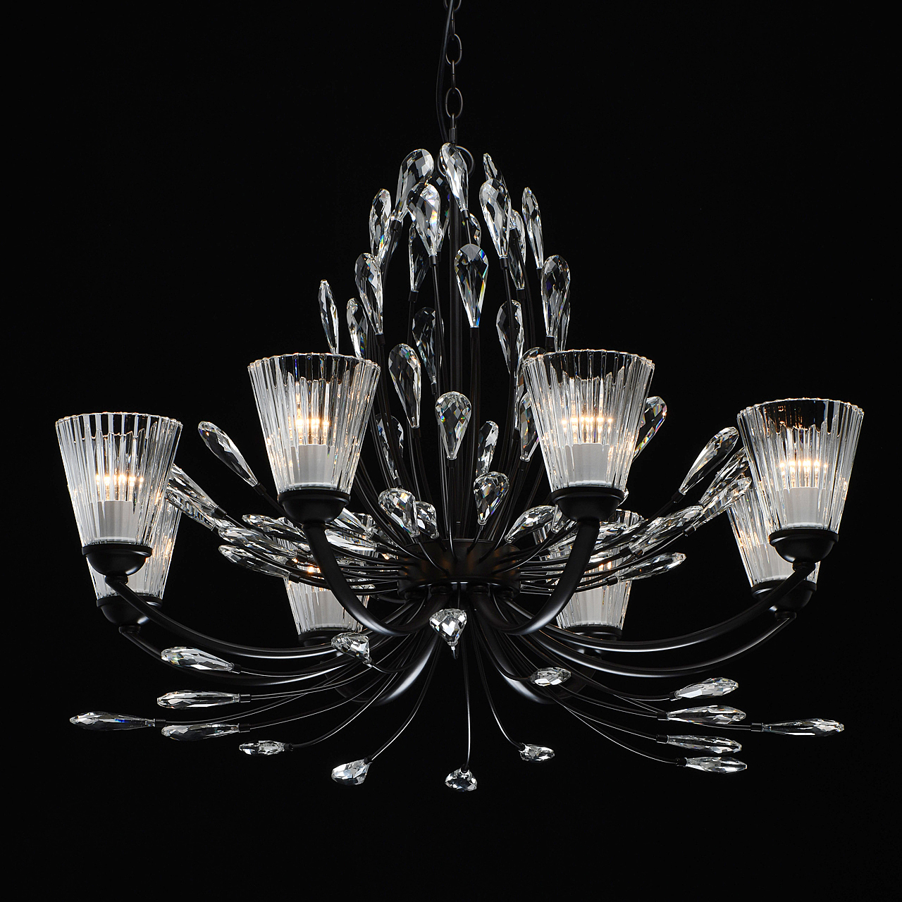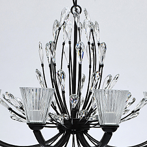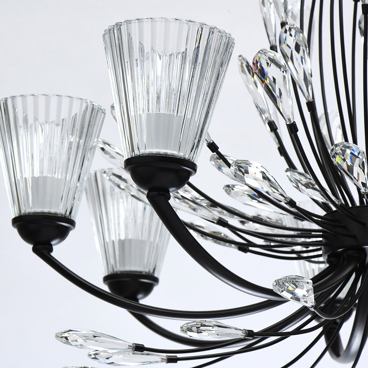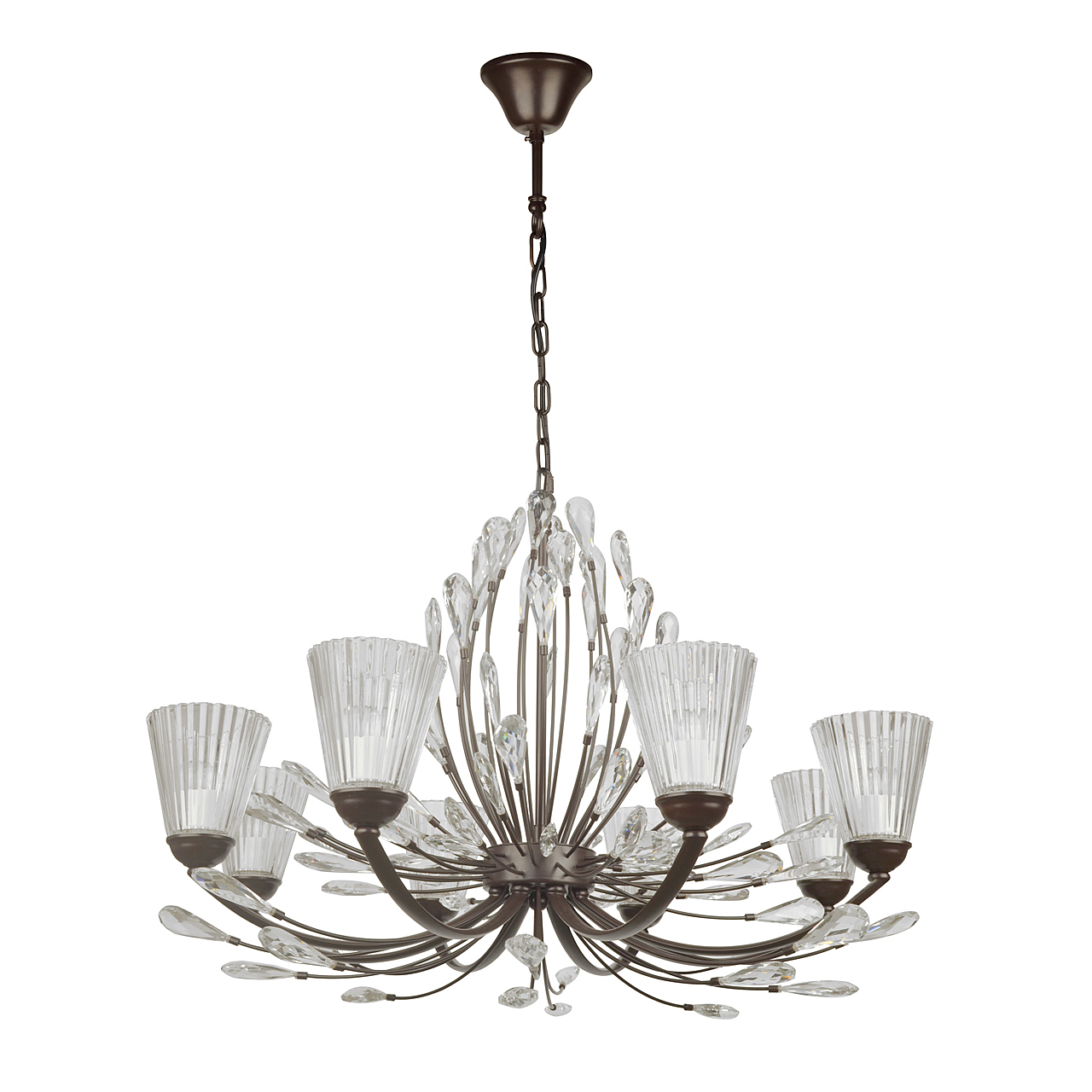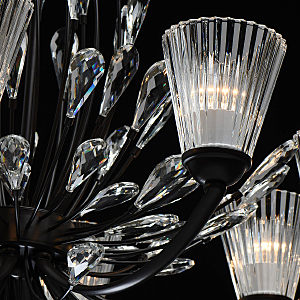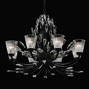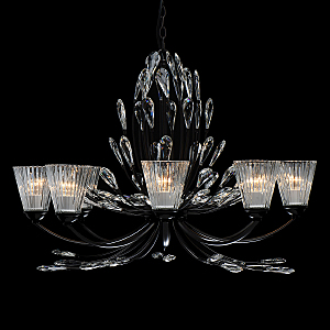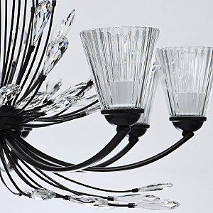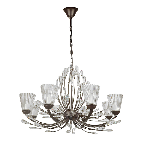 Современный флористический дизайн в тренде.Декор из крупного хрусталя особой формы придает модели легкости. Фактурные плафоны из стекла обеспечивают комфортный свет.Регулируемая высота за счет звеньев цепи.Заменяемые традиционные источники света удобны в эксплуатации.Полная семья из бра, потолочных люстр на 5 и 8 ламп.