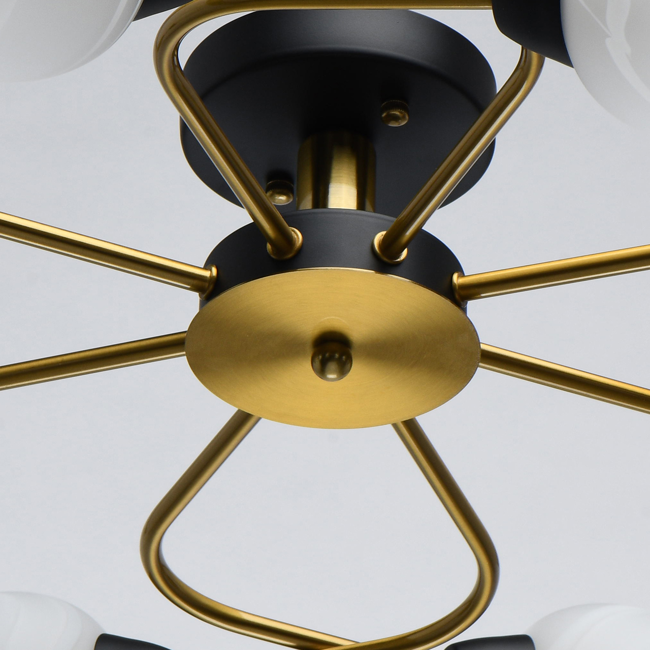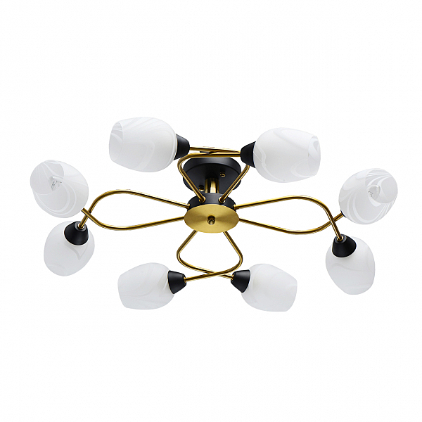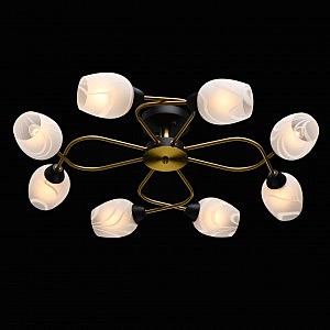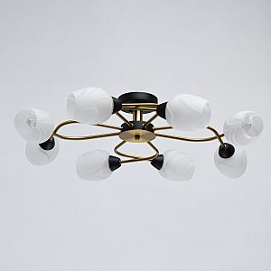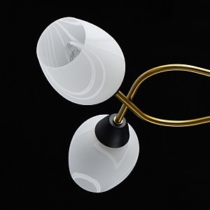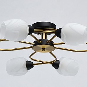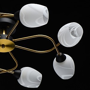 Актуальное сочетание металлического основания черного цвета и бронзы.Плафоны гладкого матового стекла с природным рисунком мягко рассеивают свет.Компактная высота модели идеальна для стандартной высоты потолка.Полная семья из бра, потолочного светильника на 6 и 8 ламп.