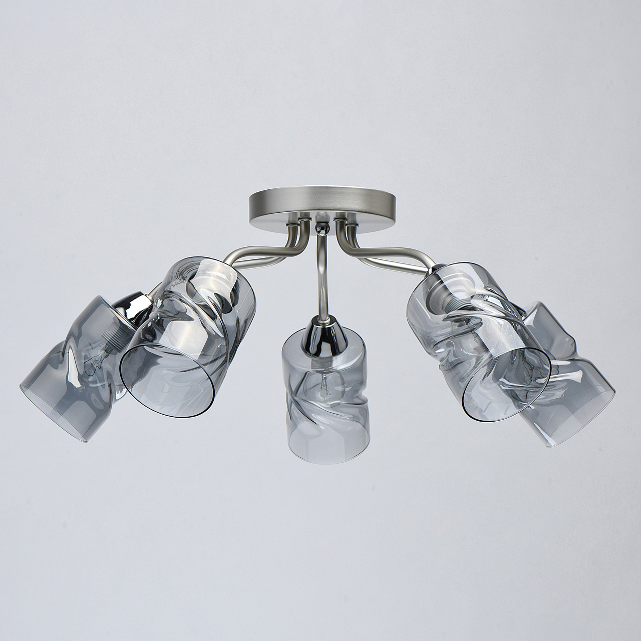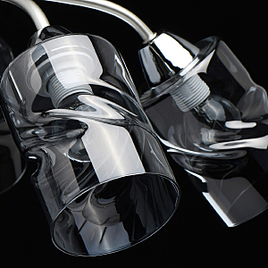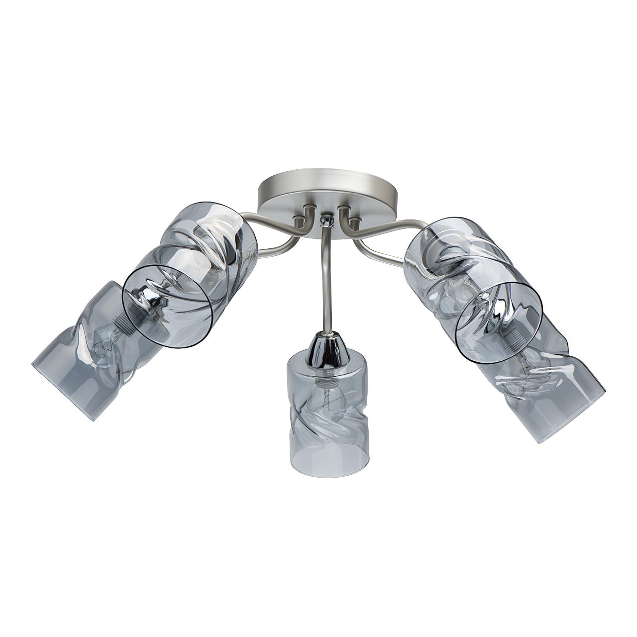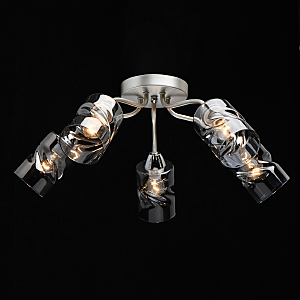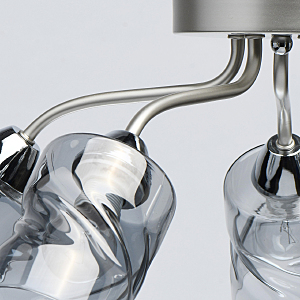 Лаконичный стиль модели с основанием перламутрового серебра универсален.Плафоны скрученной формы из дымчатого стекла обеспечивают мягкий световой поток. Компактная высота модели идеальна для стандартной высоты потолка.Заменяемые источники света удобны в эксплуатации.