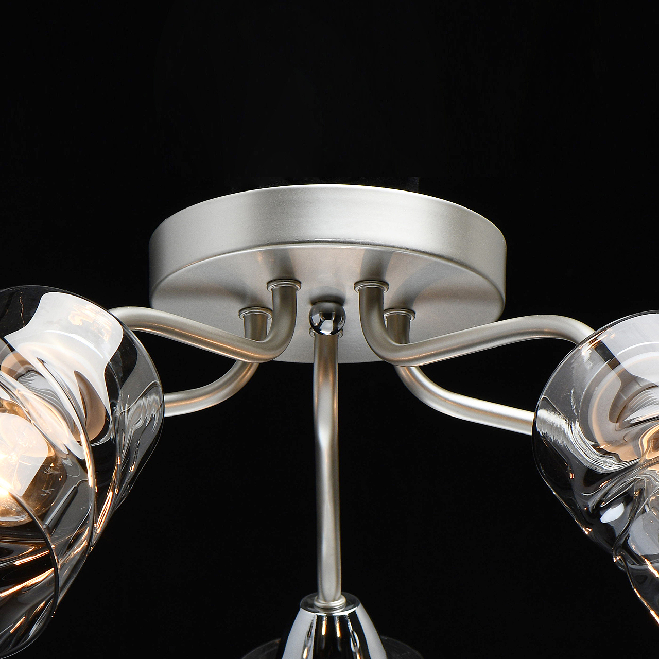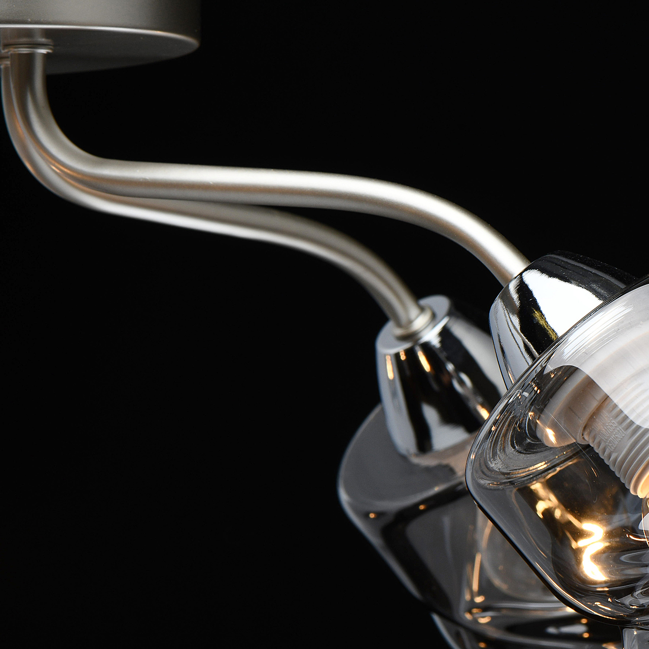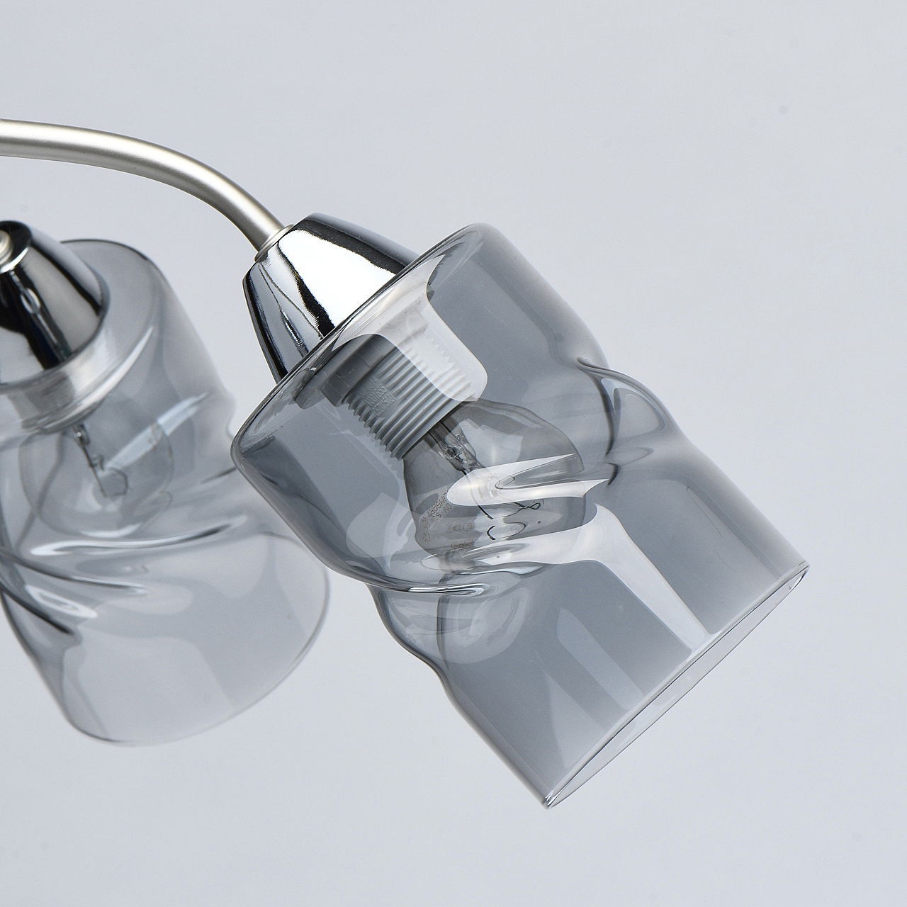 Лаконичный стиль модели с основанием перламутрового серебра универсален.Плафоны скрученной формы из дымчатого стекла обеспечивают мягкий световой поток. Компактная высота модели идеальна для стандартной высоты потолка.Заменяемые источники света удобны в эксплуатации.