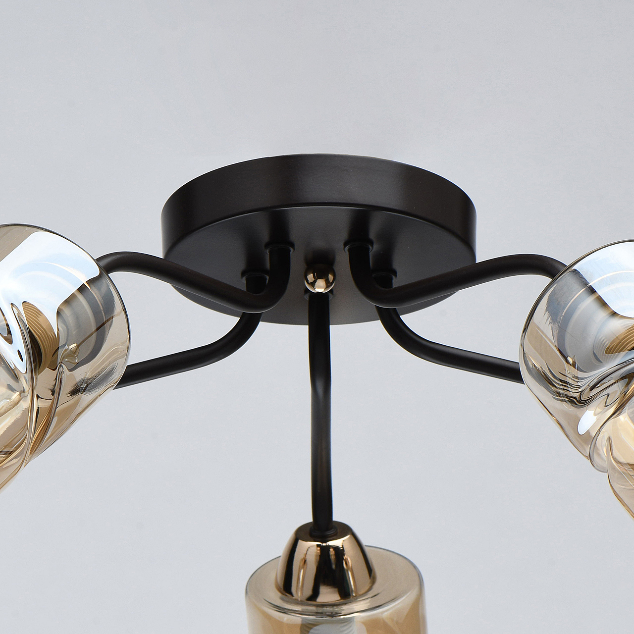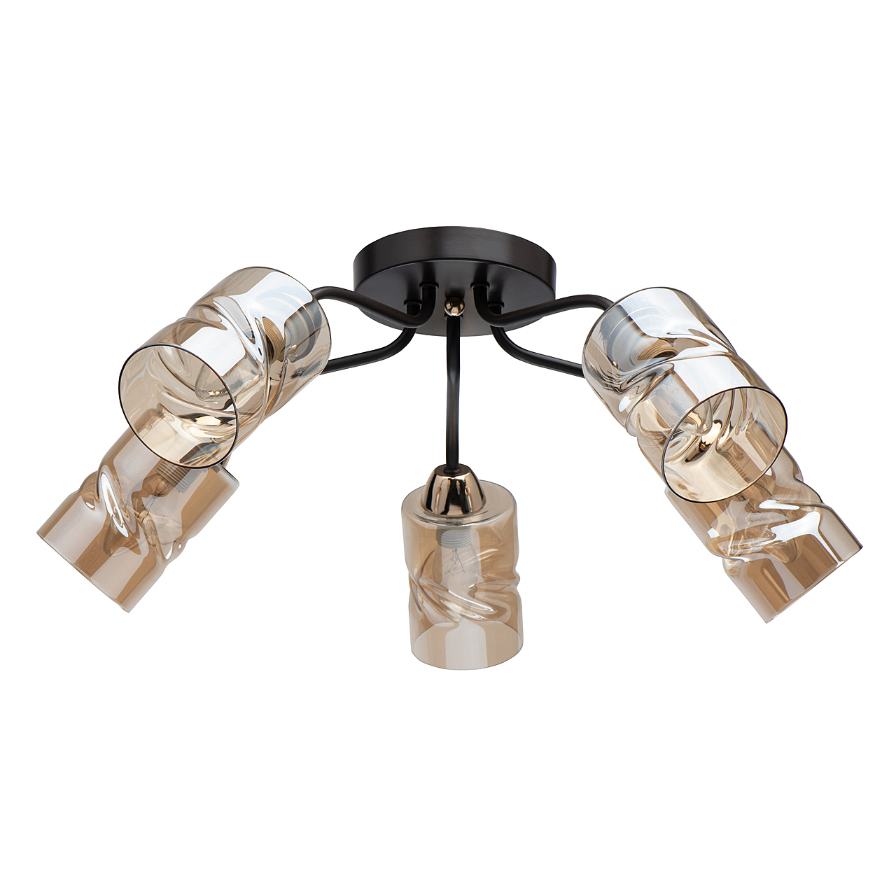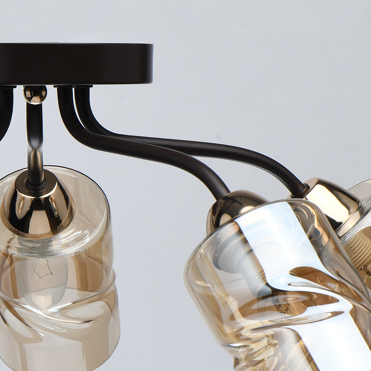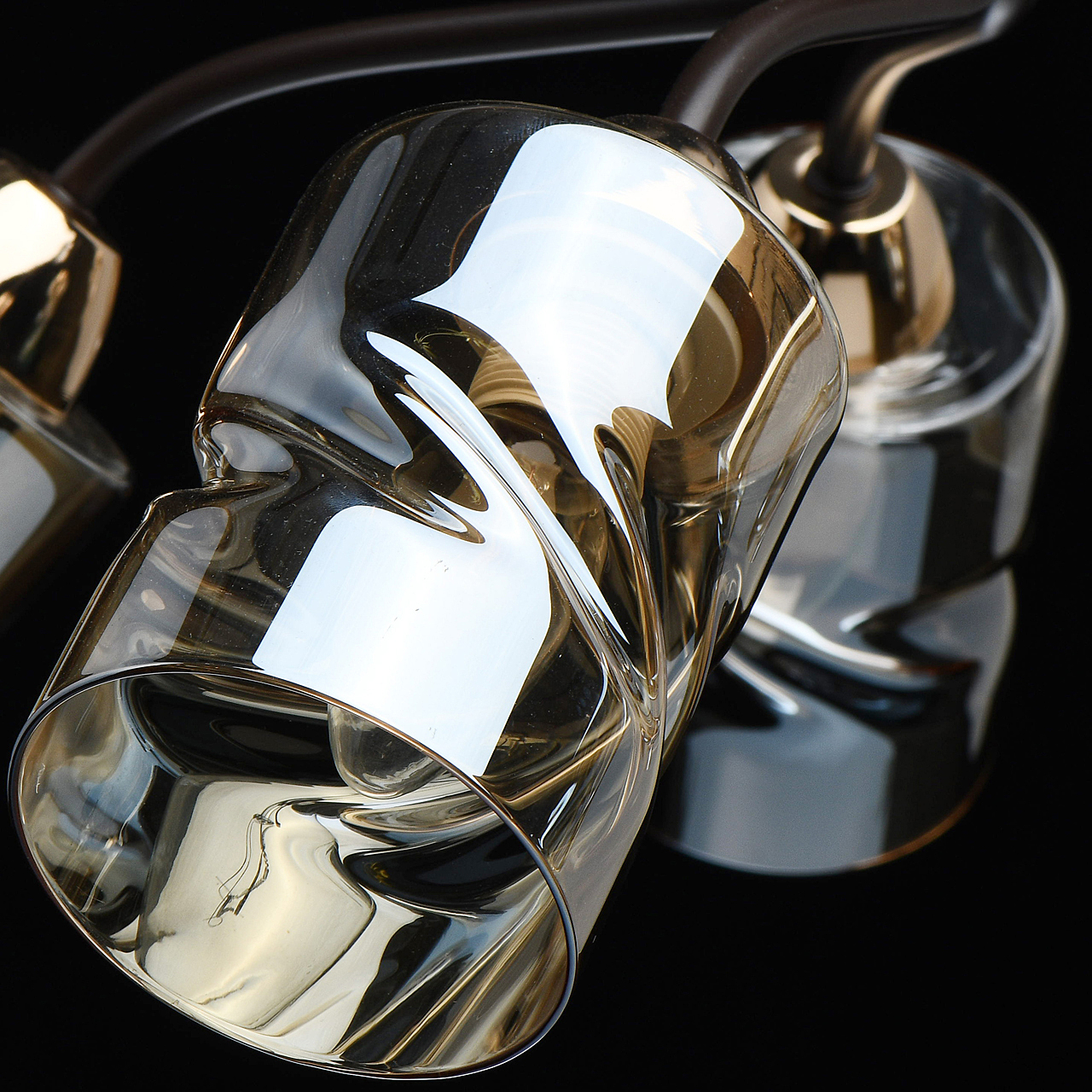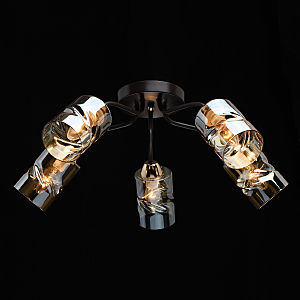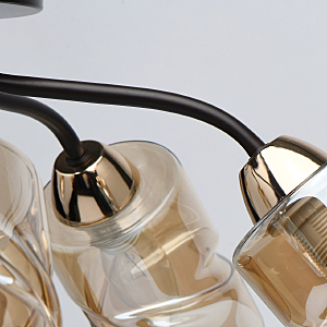 Актуальное сочетание цвета кофе и золотого в тренде.Плафоны скрученной формы из гальванизированного стекла в цвет шампань обеспечивают мягкий световой поток. Компактная высота модели идеальна для стандартной высоты потолка.Заменяемые источники света удобны в эксплуатации.