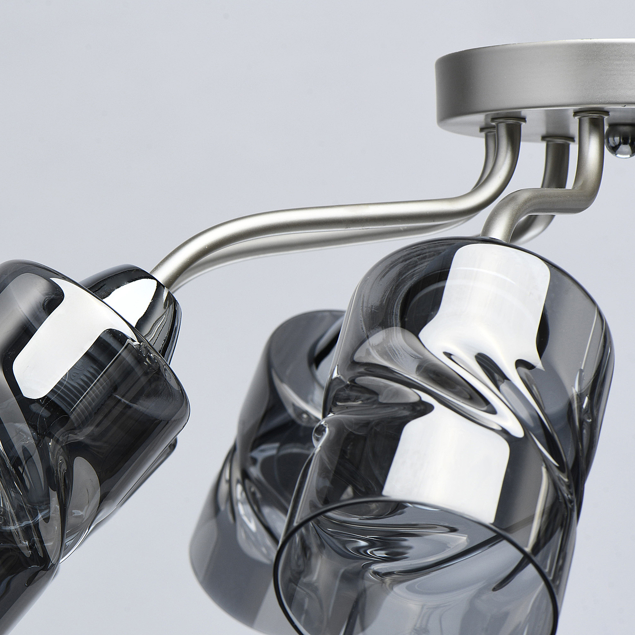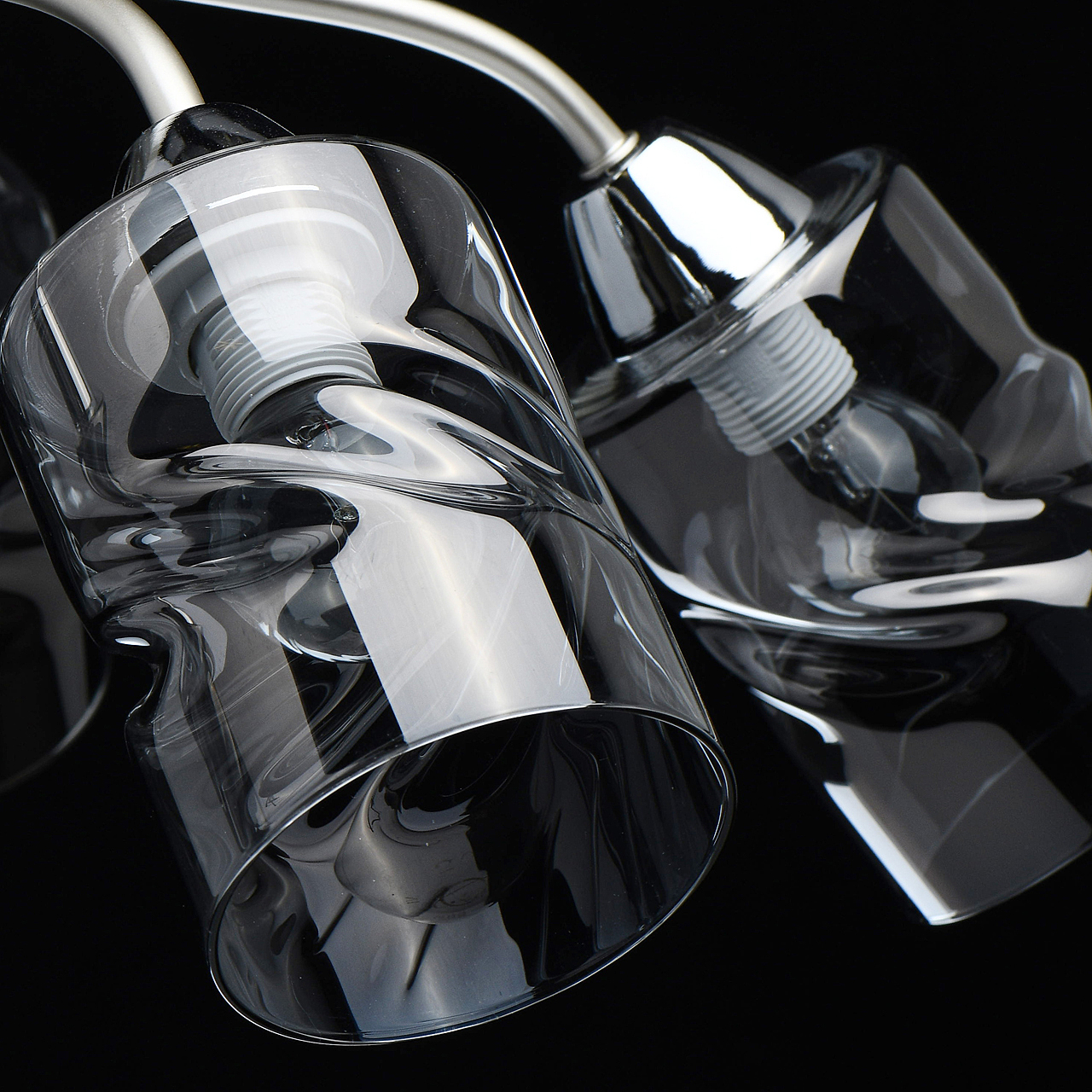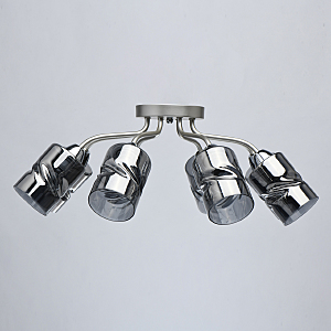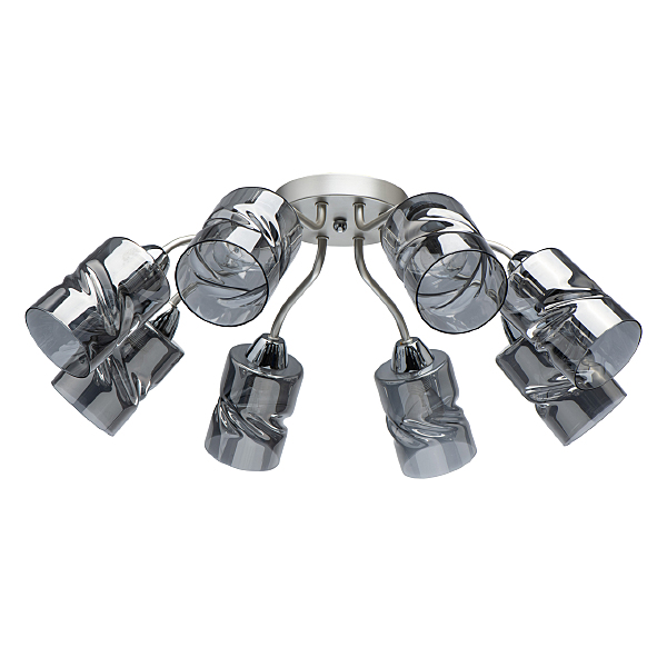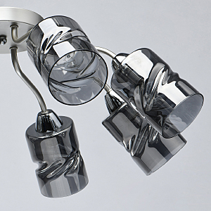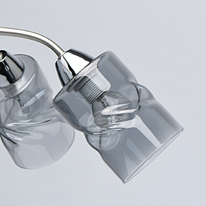 Лаконичный стиль модели с основанием перламутрового серебра универсален.Плафоны скрученной формы из дымчатого стекла обеспечивают мягкий световой поток. Компактная высота модели идеальна для стандартной высоты потолка. Заменяемые источники света удобны в эксплуатации.