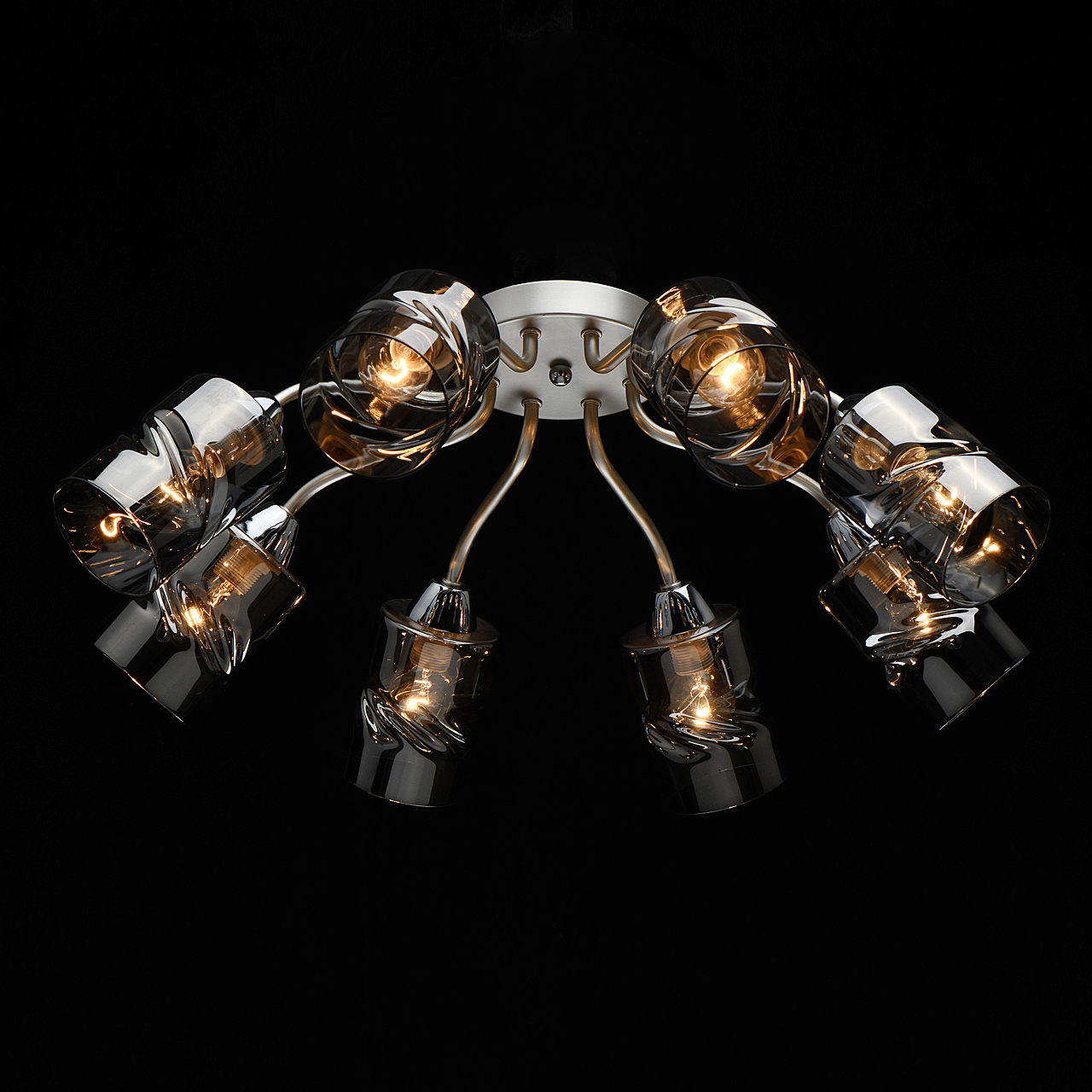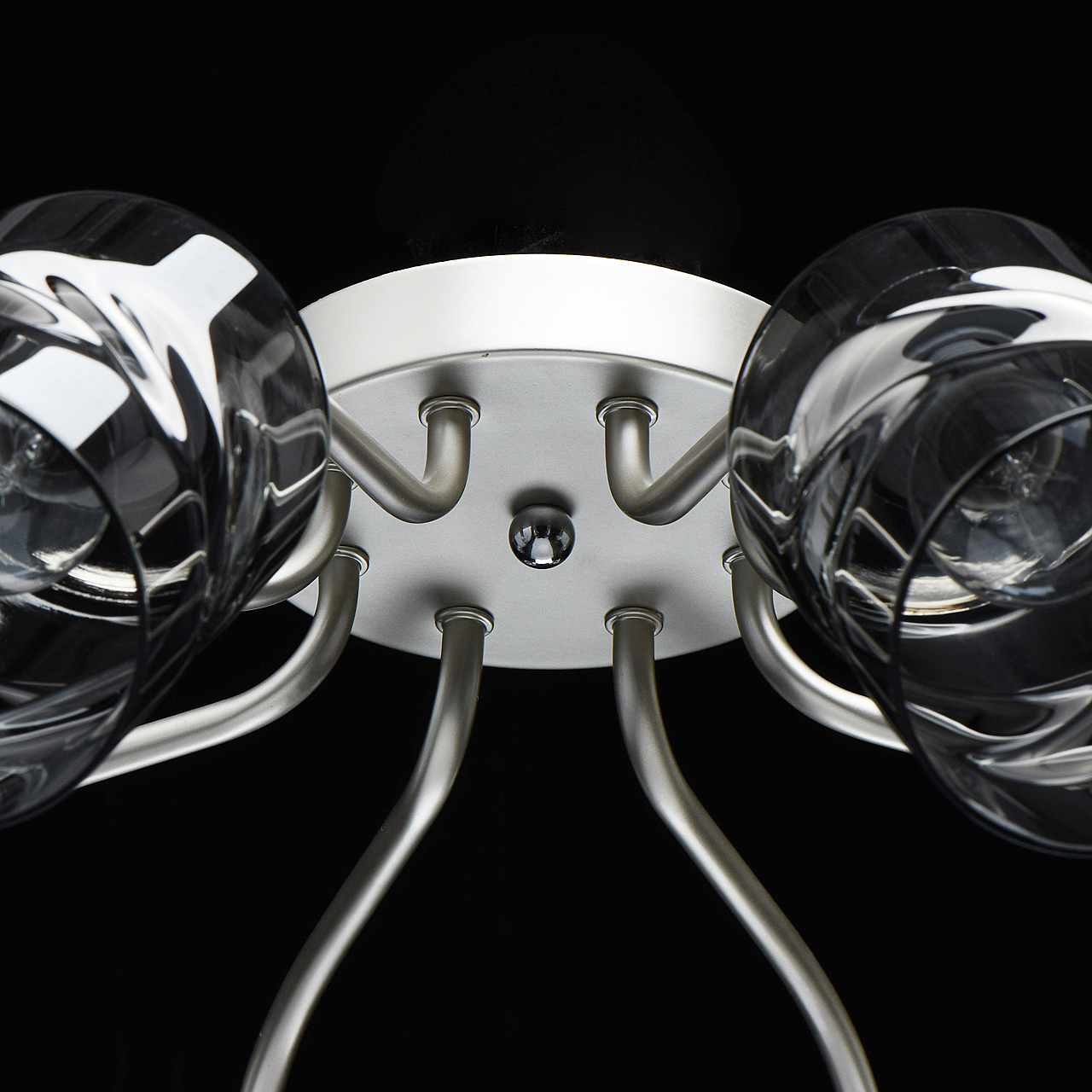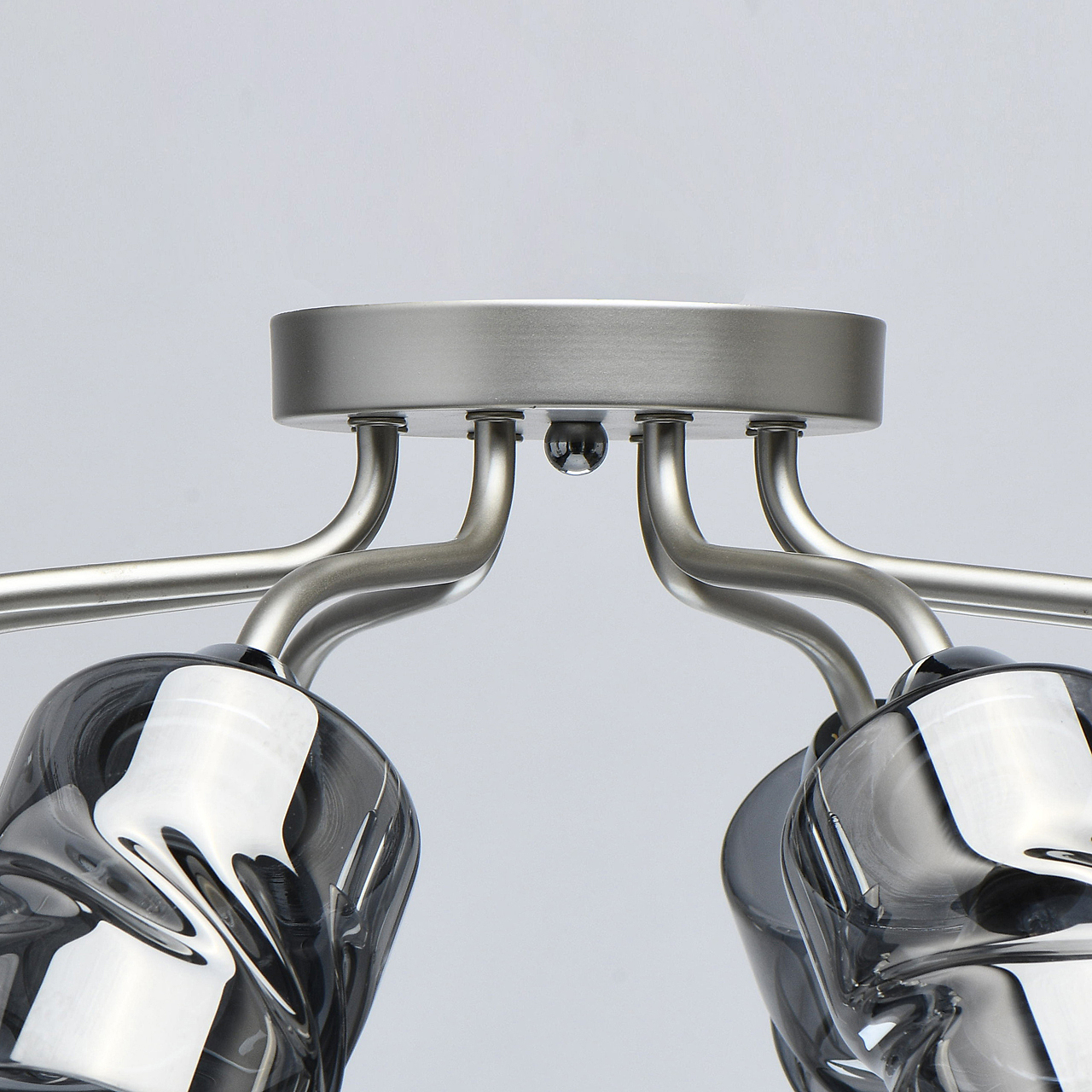 Лаконичный стиль модели с основанием перламутрового серебра универсален.Плафоны скрученной формы из дымчатого стекла обеспечивают мягкий световой поток. Компактная высота модели идеальна для стандартной высоты потолка. Заменяемые источники света удобны в эксплуатации.