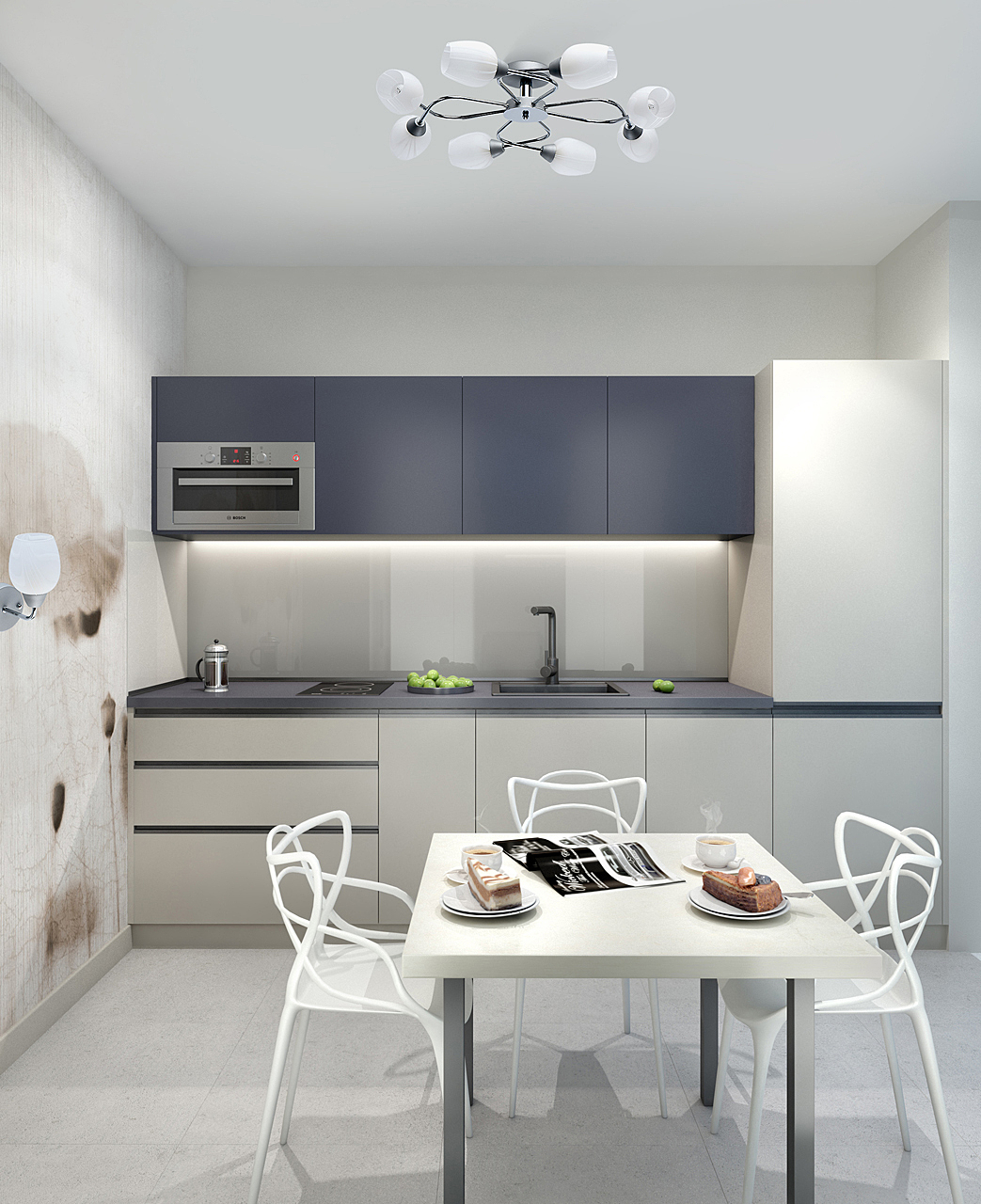 Актуальное сочетание металлического основания серого цвета и хрома.Плафон гладкого матового стекла с природным рисунком мягко рассеивает свет.Полная семья из бра, потолочного светильника на 6 и 8 ламп.