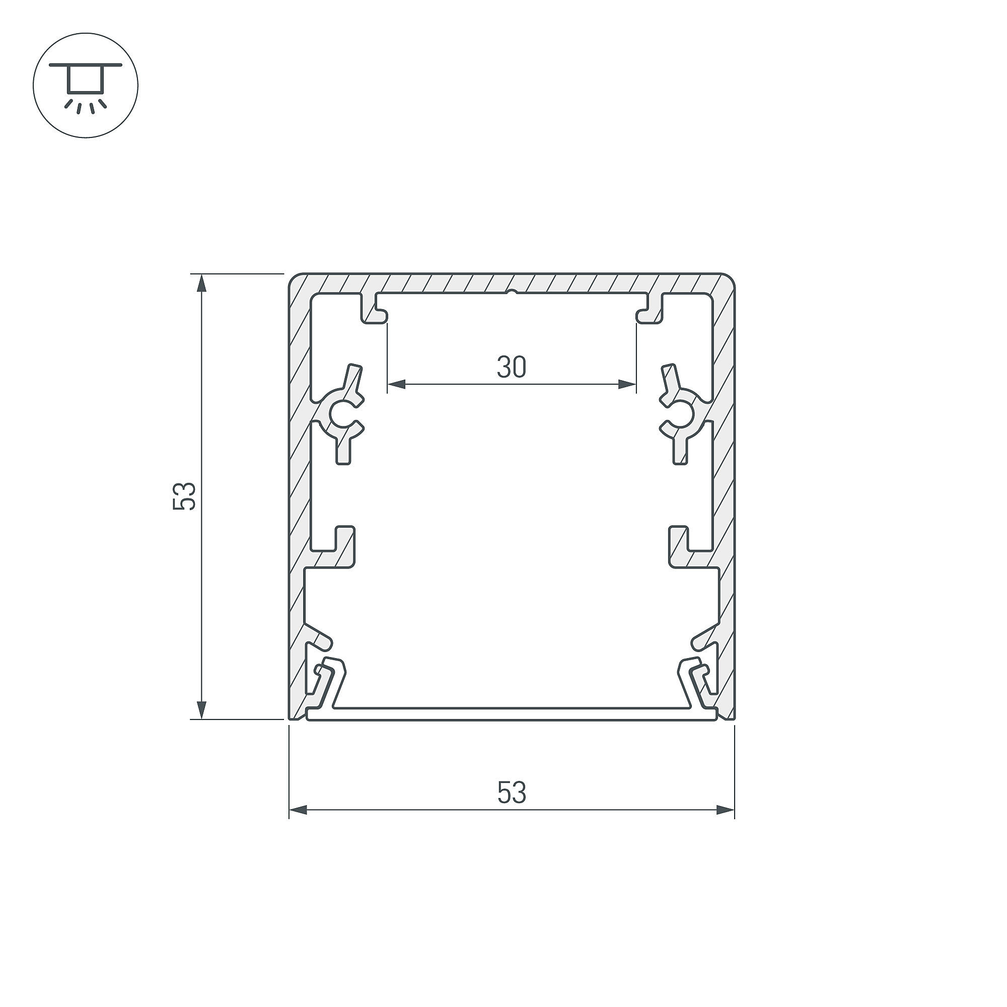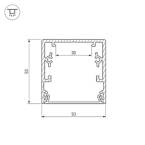 Алюминиевый анодированный профиль для светодиодных лент и линеек. Используется с микропризматическим прозрачным экраном или алюминиевым верхом. Габаритные размеры (L×W×H): 2000x53x53 мм. Ширина площадки для ленты 30 мм. Экраны, заглушки и другие аксессуары приобретаются отдельно. Цена за 1 метр.