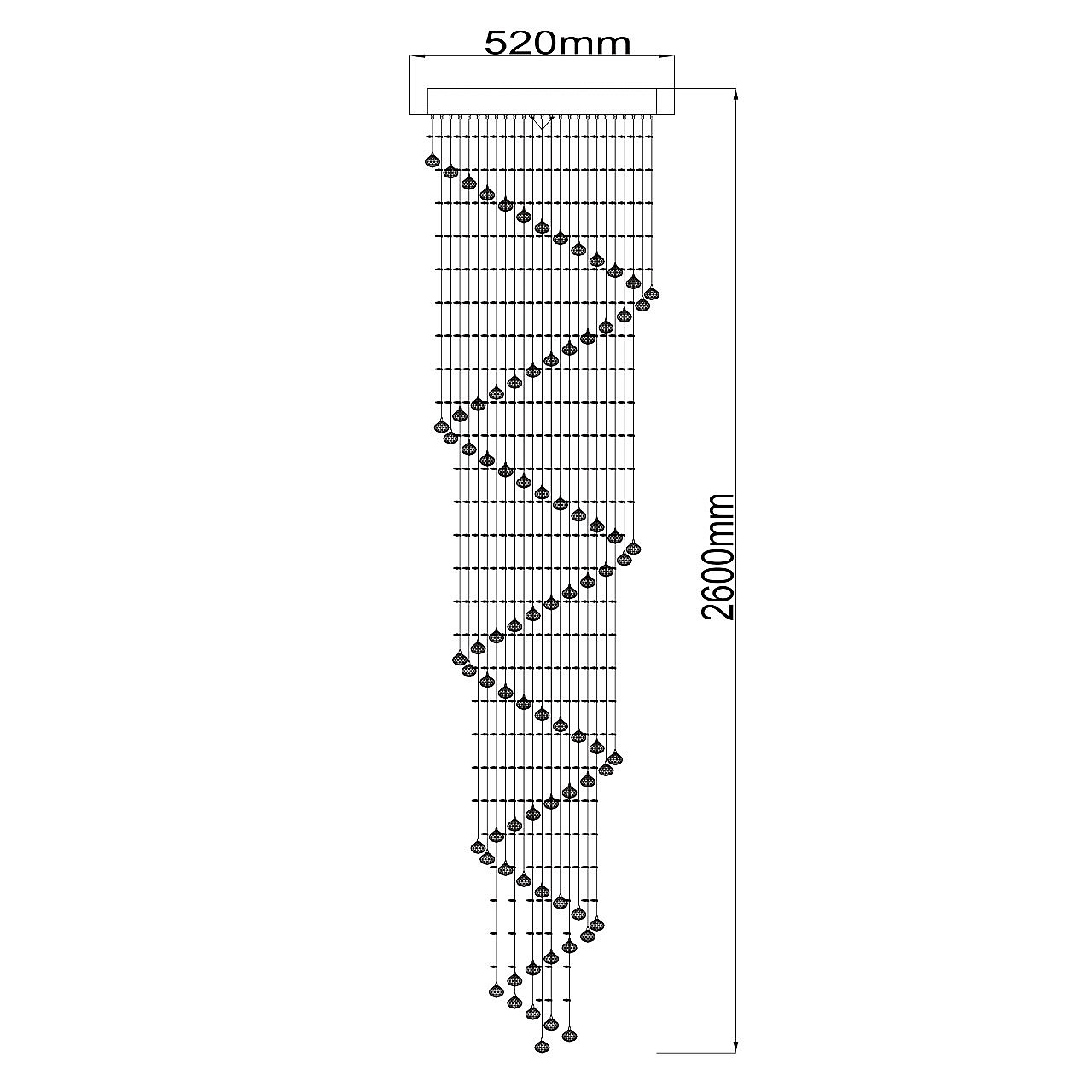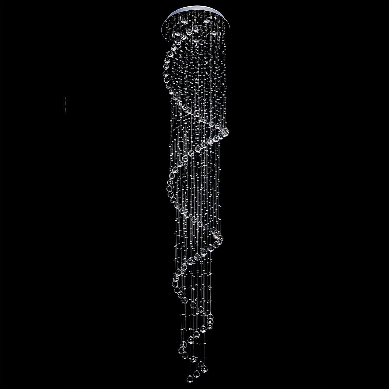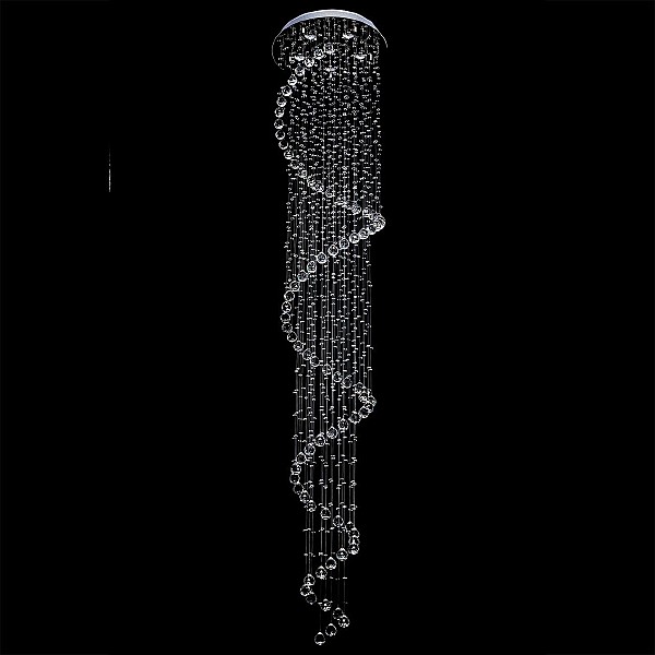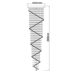 Вся градация цветового спектра передана в каждой грани водопада ромбовидных хрусталиков! Нити хрусталя, спускаясь вниз на несколько метров от основания, влекут за собой яркий свет, озаряя окружающее пространство. Искусно нанизанный хрусталь градиентом формирует образ Каскада, плавно растворяясь к низу композиции. Спиралевидная хрустальная линия, как группа знаков в нотном стане, мелодично формирует звонкое произведение, где свет и цвет являются главным аккордом!