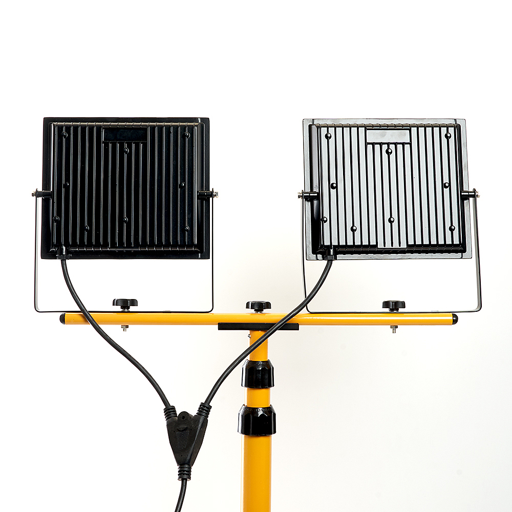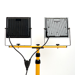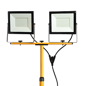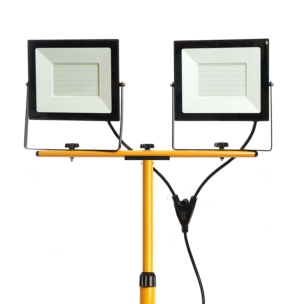 Прожектор светодиодный переносной на штативе, (ДО) FERON LL-505, 2*100W, 6400К (холодный белый), 230V/50Гц, 18000Lm, IP65, угол рассеивания 120градусов,*SMD2835, раб.t -40градусов - +40градусов, цвет черный-желтый, корпус алюминий литой под давлением + стекло, 670*552*1768мм (штатив+ голова) мм