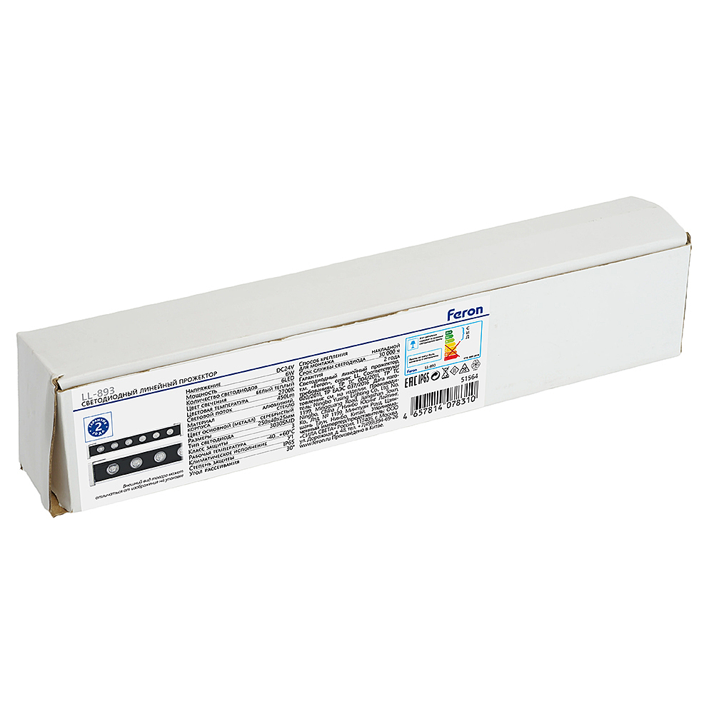 Линейный архитектурный светильник светодиодный, накладной (ДБУ) FERON LL-893, 6W, 2700К (белый теплый), DC24V 450Lm, IP65, угол рассеивания 30градусов, 6LED*3030SMD, класс защиты 3, раб.t -40градусовC - +60градусовC, цвет серебристый, корпус алюминий, стекло, 250*40*25мм,