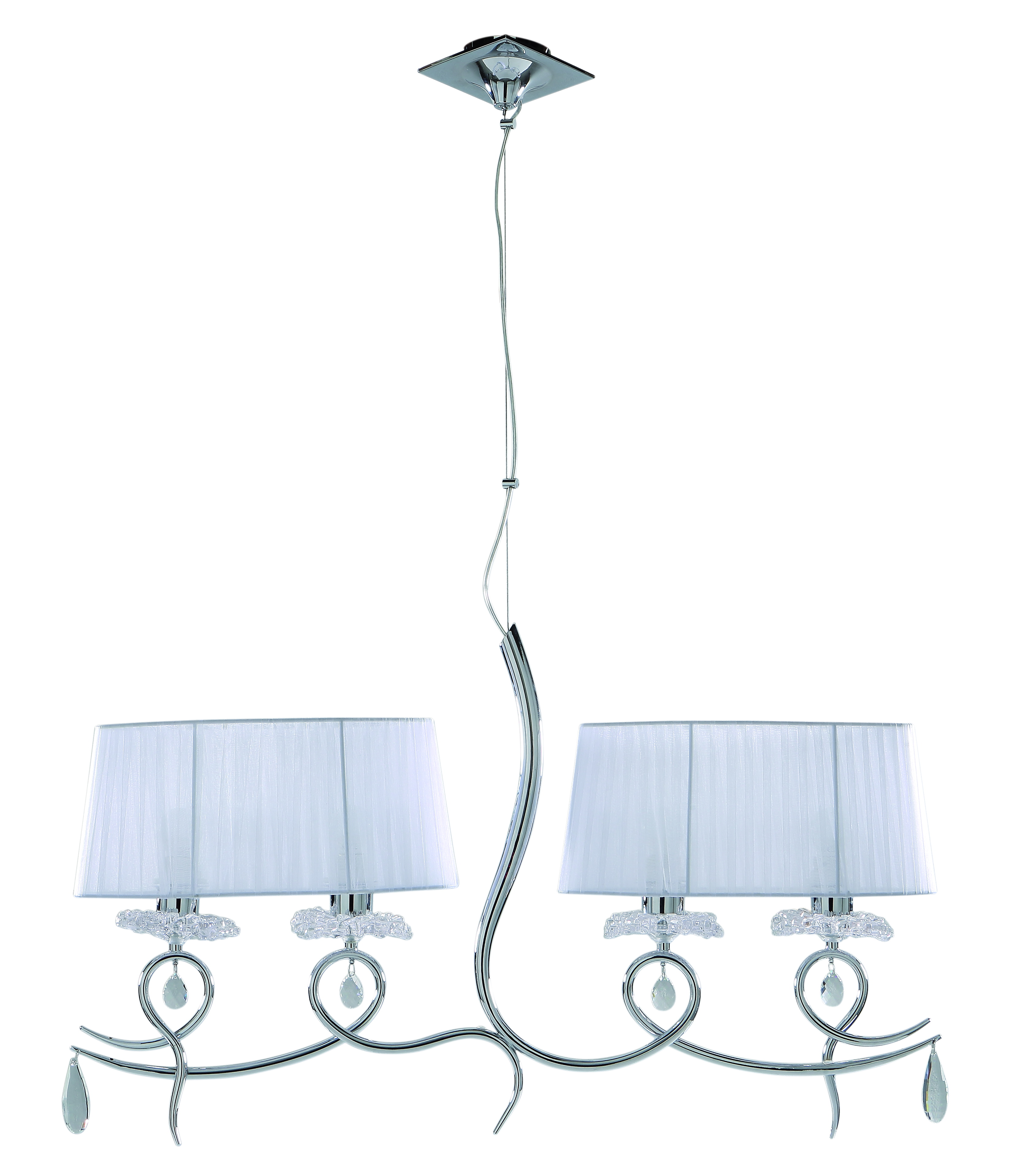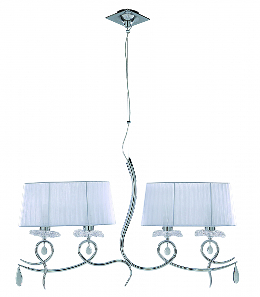 Допускается отличие страны-изготовителя, указанной в характеристиках. Линии производства могут находиться в нескольких государствах. Это не влияет на качество изготовления товара: все заводы данного бренда работают по общим стандартам, а готовые изделия проходят соответствующий контроль.Испания Коллекция Louise ЦветЦвет арматуры Хром Цвет Хром Материал арматуры Металл Цвет плафона Белый Материал плафона Ткань РазмерыВысота (мм) 1500 Длина (мм) 926 Ширина (мм) 180 ЭлектрикаКоличество ламп (шт) 4 Цоколь E27 Мощность лампы (Вт) 13W Напряжение (В) 220 Дополнительная информацияТип подвеса На тросах -