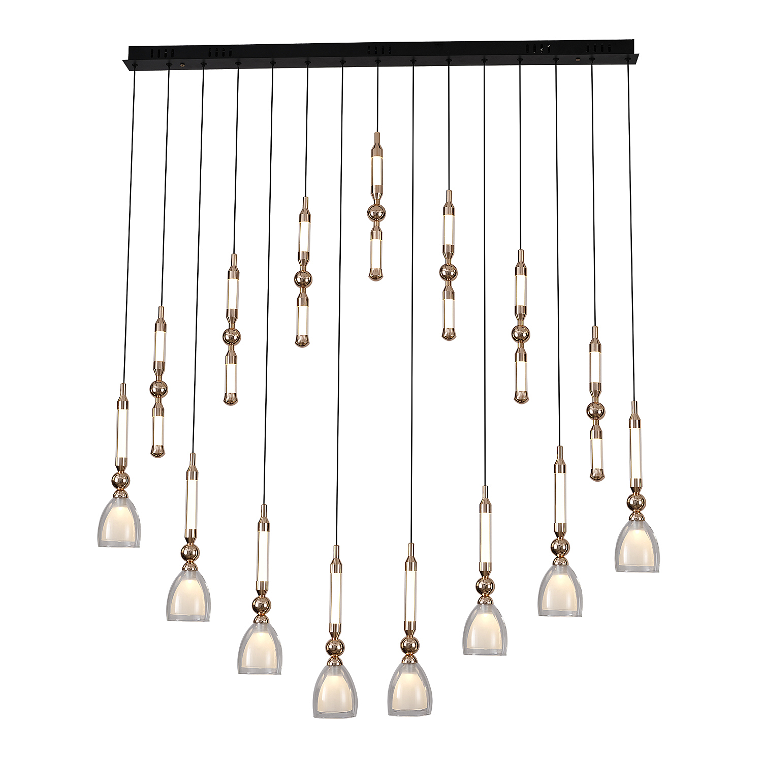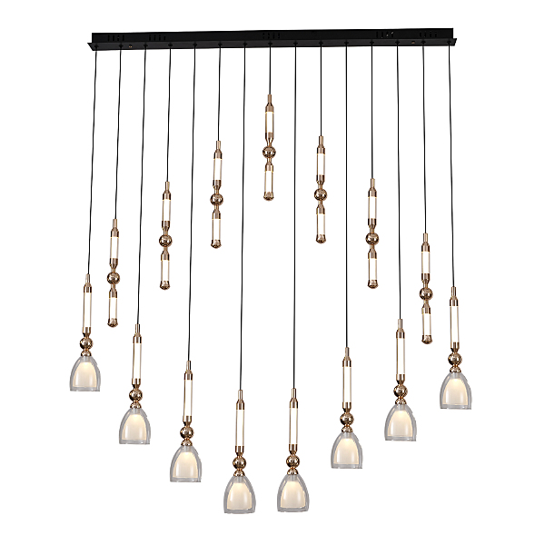 Допускается отличие страны-изготовителя, указанной в характеристиках. Линии производства могут находиться в нескольких государствах. Это не влияет на качество изготовления товара: все заводы данного бренда работают по общим стандартам, а готовые изделия проходят соответствующий контроль.Италия ЦветЦвет арматуры Черный, блестящее золото Цвет Черный Материал арматуры Металл Цвет плафона Белый Материал плафона Акрил РазмерыВысота (мм) 2000 Диаметр (мм) 100 Высота минимальная (мм) 2000 Ширина (мм) 1180 ЭлектрикаКоличество ламп (шт) 15 Цоколь LED Мощность лампы (Вт) 3 Общая мощность (Вт) 45 Световой поток 3760 Цветовая температура 3000 Дополнительная информацияТехническая оссобеность Полностью светодиодная Тип подвеса На тросах Количество подвесов Много подвесных элементов -