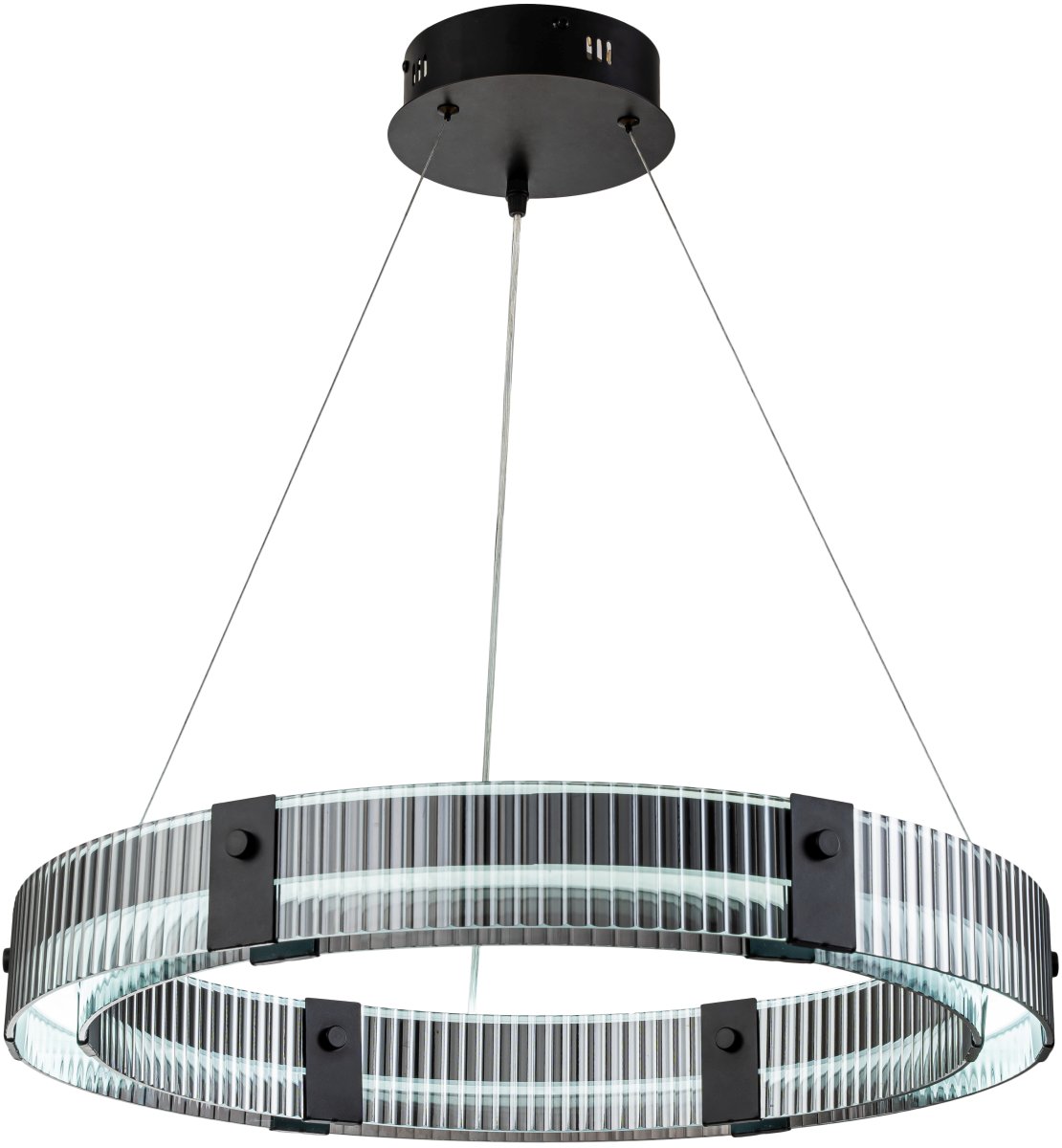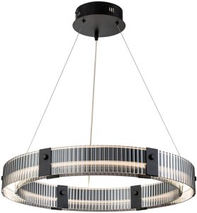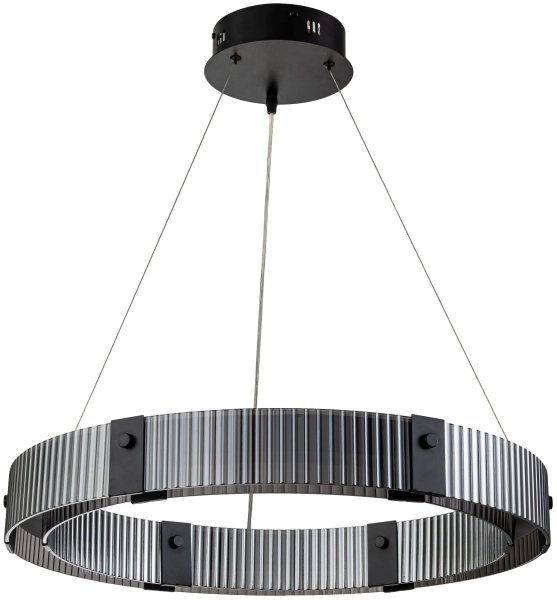 Люстра подвесная коллекции Lucen выполнена из металла, окрашенного в черный цвет, и рифленый плафон из стекла закругленной формы дымчатого цвета. Люстра комплектуется пультом дистанционного управления 2,4G и драйвером высокого качества с европейским стандартом T?V. Пульт дистанционного управления обеспечивает переключение трех режимов световой температуры и диммирование.