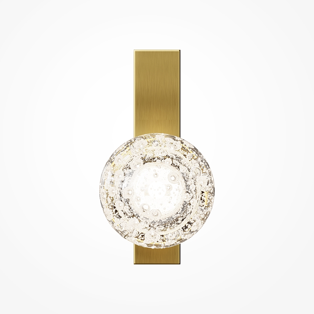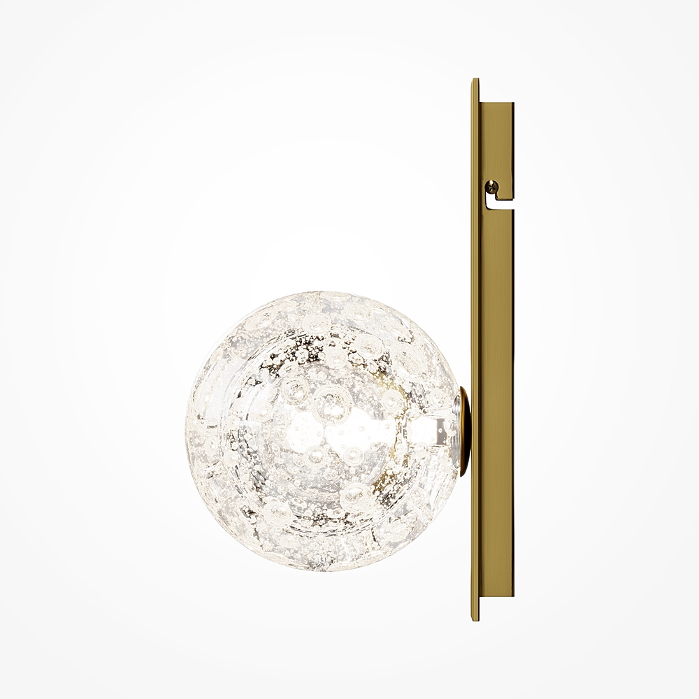 Плафон выполнен из стекла ручной работы с уникальными выдувными пузырьками. Арматура выполнена из алюминия в цвете сатинированной латуни. Сменный источник света с цоколем G9. Каждый светильник уникален благодаря индивидуальной технике ручного выдувания стекла. Обеспечивает мягкое рассеянное освещение, идеально подчеркивающее текстуру стекла. Предназначен для создания изысканных акцентов в интерьерах классического стиля и ар-деко. Рекомендуется для гостиных, спален, коридоров и ресторанов.