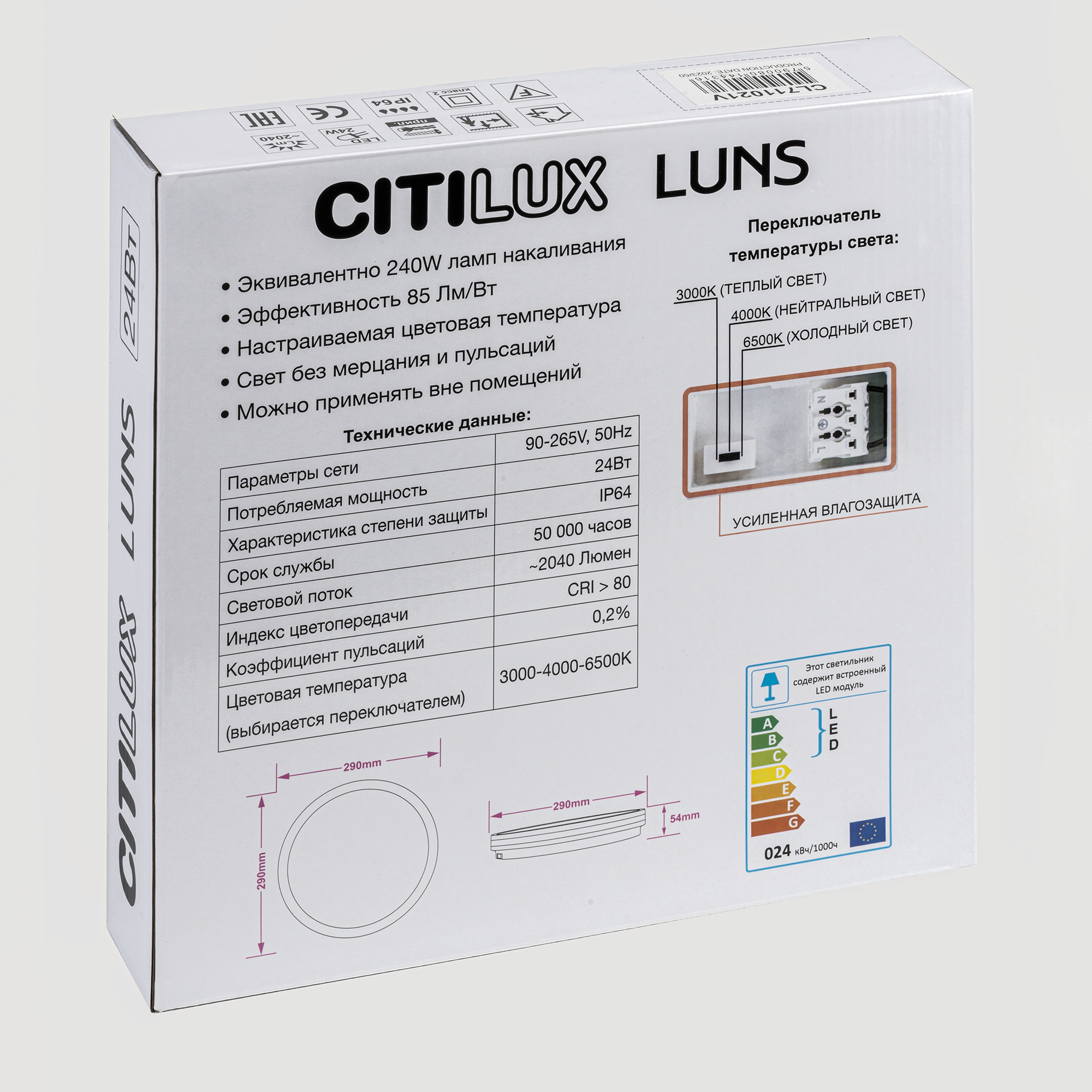 | Техническая оссобеность | Полностью светодиодная, Регулировка цветовой температуры |