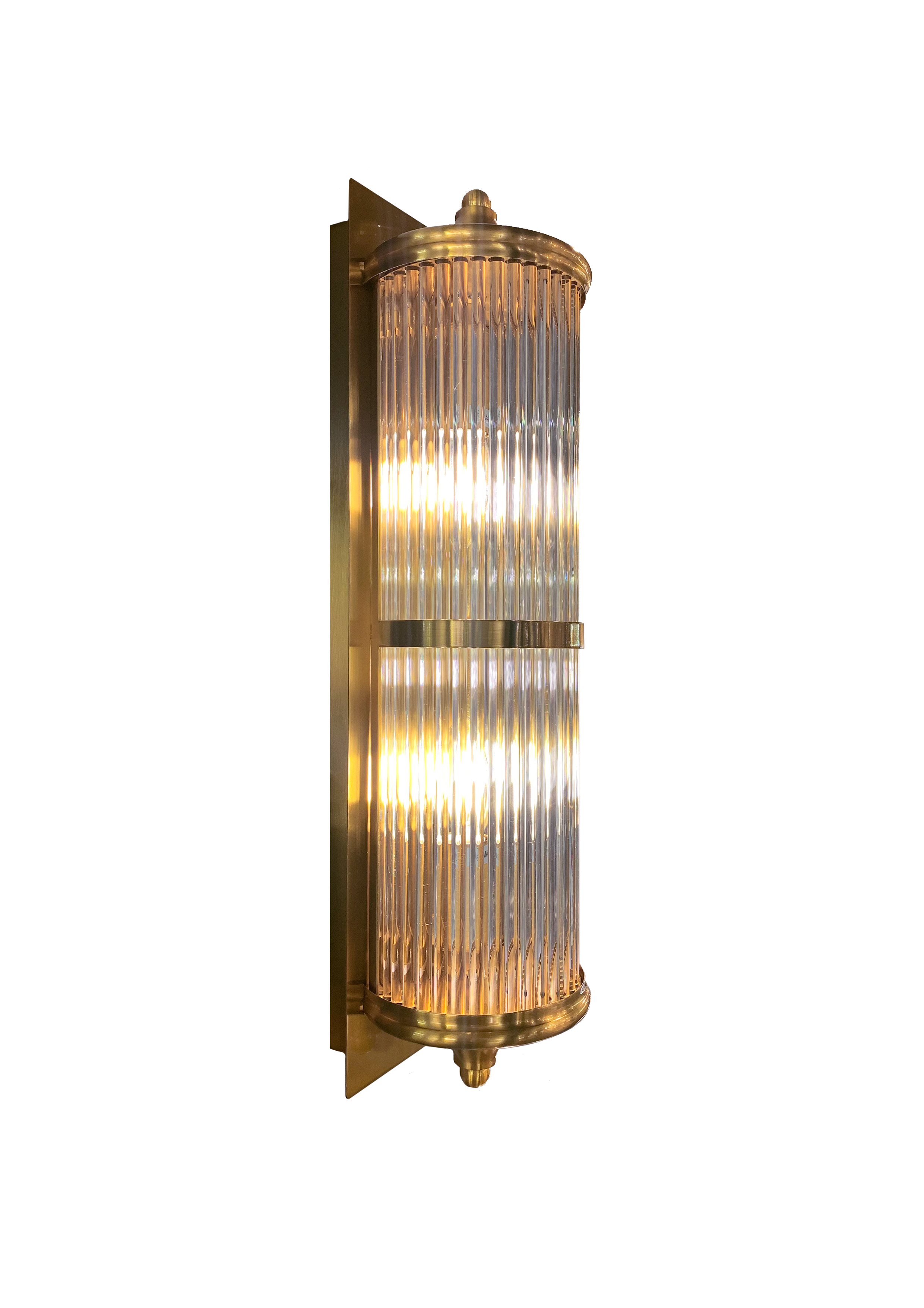 Роскошный бра в стиле ар-деко, украшенный длинными стеклянными палочками и золотой окантовкой. Глянцевое золото ярко переливается и дарит атмосферу праздника интерьеру даже если вы не включаете свет. Две лампы в бра мягко рассеивают свет и при этом освещают пространство. Свет, проходящий через стеклянные палочки, оставляет красивые блики на стенах и добавляет в просранство динамику.