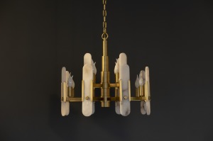 Яркая золотая люстра на 12 рожков с декоративными мраморными элементами.