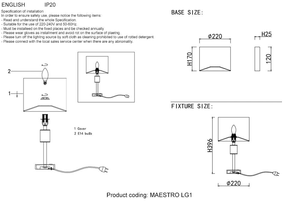 Допускается отличие страны-изготовителя, указанной в характеристиках. Линии производства могут находиться в нескольких государствах. Это не влияет на качество изготовления товара: все заводы данного бренда работают по общим стандартам, а готовые изделия проходят соответствующий контроль.Испания Коллекция Maestro ЦветЦвет арматуры Хром, Черный Цвет Хром Материал арматуры Металл Цвет плафона Белый, прозрачный Материал плафона Тканевый РазмерыВысота (мм) 396 Диаметр (мм) 220 Высота минимальная (мм) 396 Ширина (мм) 220 ЭлектрикаКоличество ламп (шт) 1 Цоколь E14 Мощность лампы (Вт) 60 Дополнительная информацияСтепень защиты (IP) 20 Тип выключателя Выключатель на шнуре -