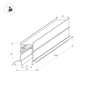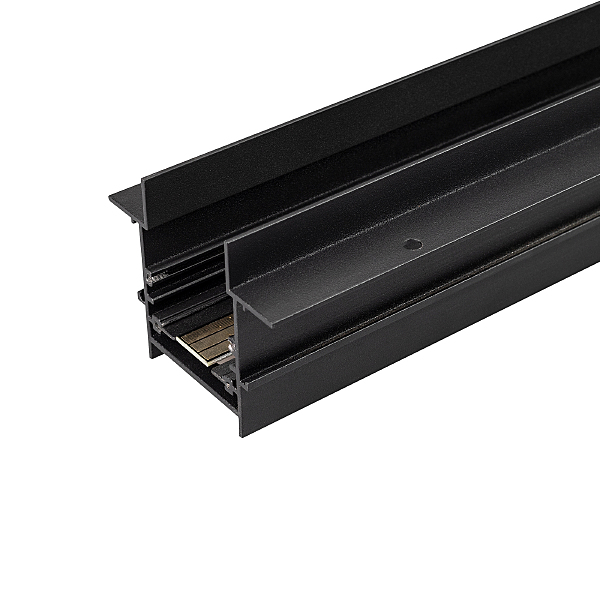 Встраиваемый магнитный трек с фланцем для монтажа в гипсокартонный потолок, длина 3000 мм. DC24V. Материал алюминий, цвет черный. Две заглушки в комплекте. Размер ДxШxВ: 3000x75x60 мм. Размер (с учетом заглушек и фланцев) ДxШxВ: 3040x75x60 мм. DC24V.