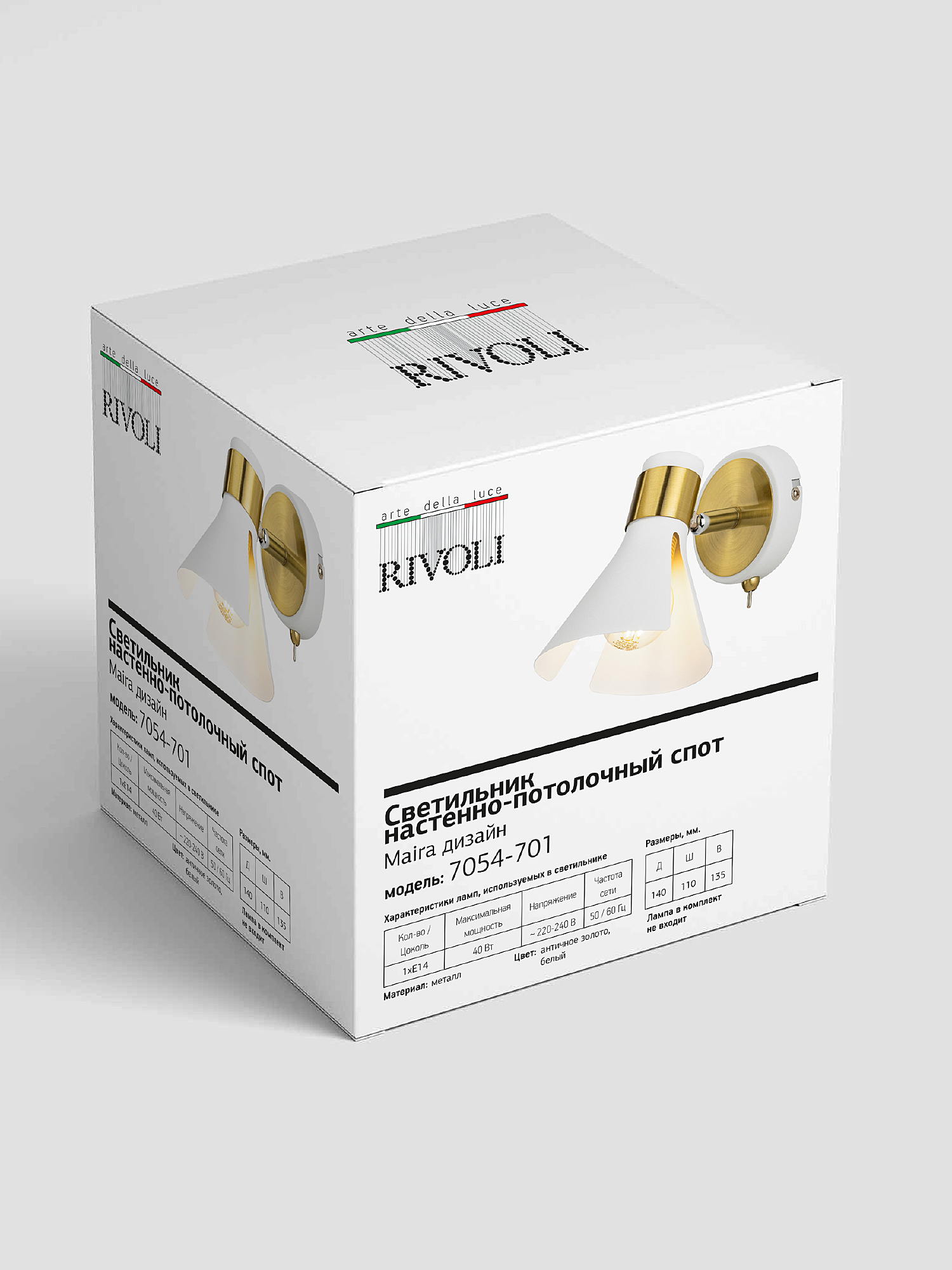 Допускается отличие страны-изготовителя, указанной в характеристиках. Линии производства могут находиться в нескольких государствах. Это не влияет на качество изготовления товара: все заводы данного бренда работают по общим стандартам, а готовые изделия проходят соответствующий контроль.Италия Коллекция Maira ЦветЦвет арматуры Белый, античное золото Цвет Белый Материал арматуры Металл Цвет плафона Белый Материал плафона Металл РазмерыВысота (мм) 135 Длина (мм) 140 Ширина (мм) 110 ЭлектрикаКоличество ламп (шт) 1 Цоколь E14 Мощность лампы (Вт) 40 Напряжение (В) 220 Площадь освещения 3 Дополнительная информацияСпособ крепления Планка Степень защиты (IP) IP20 Тип выключателя Выключатель на корпусе Вес (Кг) 0,27 -