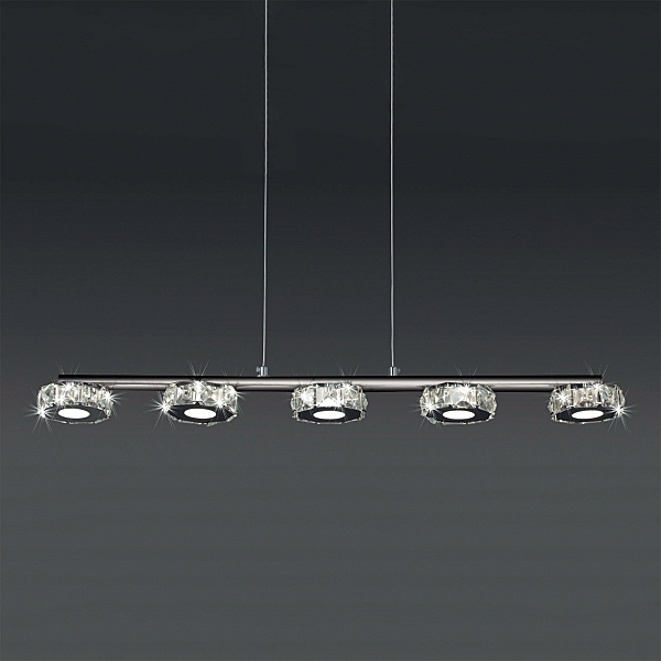 Допускается отличие страны-изготовителя, указанной в характеристиках. Линии производства могут находиться в нескольких государствах. Это не влияет на качество изготовления товара: все заводы данного бренда работают по общим стандартам, а готовые изделия проходят соответствующий контроль.Испания Коллекция Crystal ЦветЦвет арматуры Черный Цвет Хром Материал арматуры Металл Цвет декора прозрачный Цвет плафона прозрачный Материал декора Хрусталь Материал плафона Стекло, Хрусталь РазмерыВысота (мм) 1500 Длина (мм) 760 Высота минимальная (мм) 200 Ширина (мм) 95 ЭлектрикаКоличество ламп (шт) 5 Цоколь LED Тип лампы Светодиодная Лампочки в комплекте Лампы в комплекте Возможность подключение диммера Нет Мощность лампы (Вт) 6 Общая мощность (Вт) 30 Напряжение (В) 220 Мощность эквивалентная лампе накаливания 300 Дополнительная информацияСтепень защиты (IP) IP20 Техническая оссобеность Полностью светодиодная Тип подвеса На тросах Количество подвесов Одиночный подвес -
