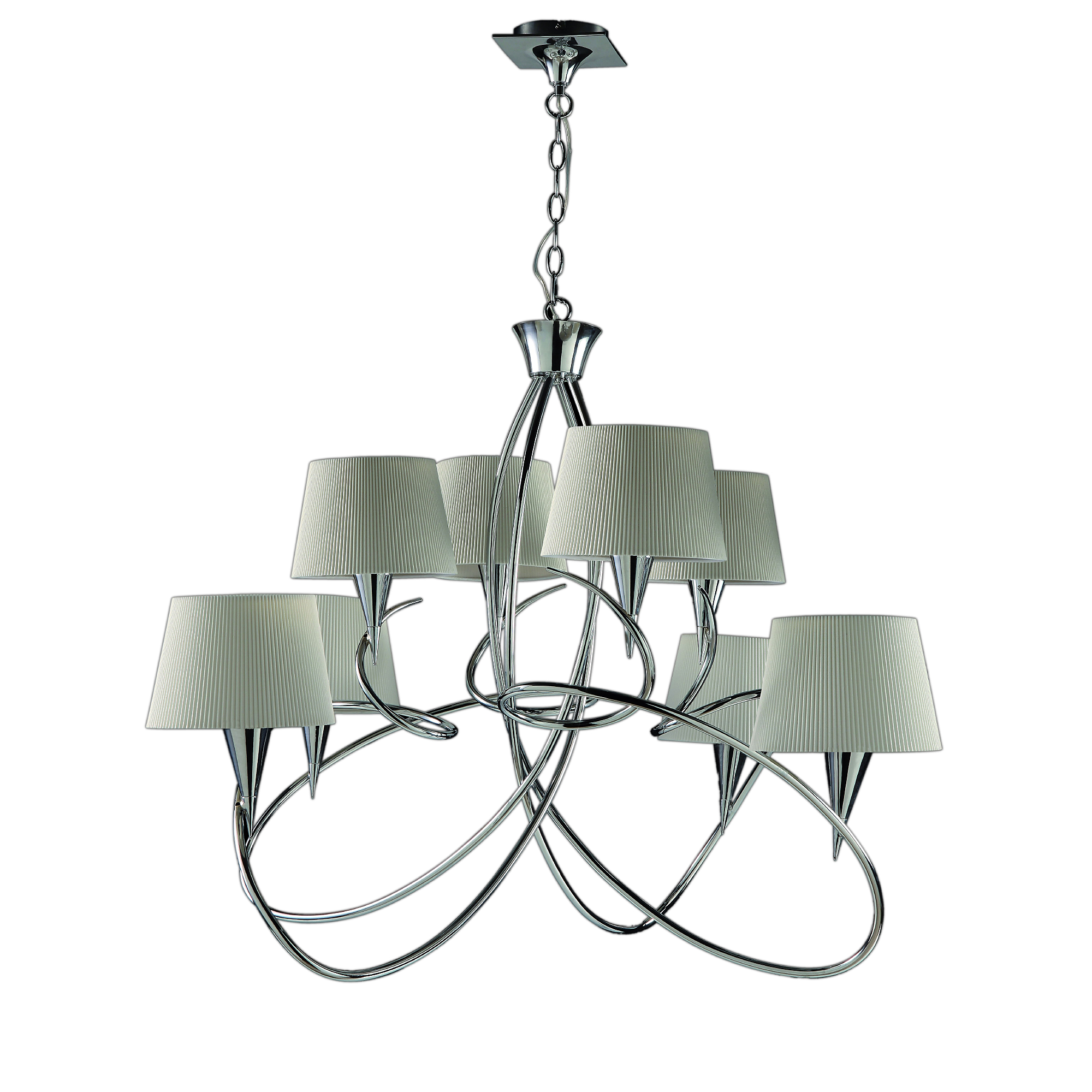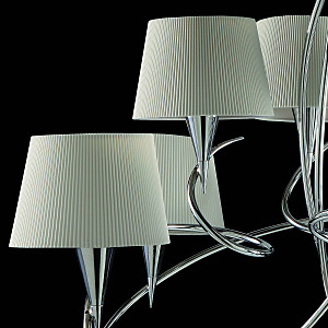 MARA - коллекция изысканных и замысловатых форм, состоящая из переплетающихся тонких рам, создавая трехмерную структуру и визуальный образ движения. Из коллекции выделяется пышная двухъярусная люстра, которая станет смелым и притягательным предметом для большой гостиной или столовой зоны. Также лаконичные настольные лампы и торшер MARA прекрасно завершат интерьер и поддержат общий стиль, не перегружая композицию.Коллекция имеет яркую отполированную хромированную или латунную отделку. Металлическая конструкция сочетается с белыми оттенками плиссированных тканей абажура, создавая индивидуальные решения для вашего интерьера. MARA имеет традиционную атмосферу с современным уклоном. Она потрясает и интригует зрителя. Предметы коллекции станут идеальным дополнением для классических и просторных пространств.