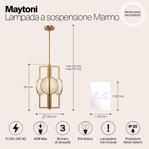 Допускается отличие страны-изготовителя, указанной в характеристиках. Линии производства могут находиться в нескольких государствах. Это не влияет на качество изготовления товара: все заводы данного бренда работают по общим стандартам, а готовые изделия проходят соответствующий контроль.Германия Коллекция Marmo ЦветЦвет арматуры Золото Цвет Золото Материал арматуры Металл Цвет плафона Белый РазмерыВысота (мм) 927 Диаметр (мм) 305 Высота минимальная (мм) 727 Ширина (мм) 305 ЭлектрикаКоличество ламп (шт) 3 Цоколь E14 Лампочки в комплекте Нет в комплекте Мощность лампы (Вт) 40 Напряжение (В) 220 Дополнительная информацияСпособ крепления Планка Степень защиты (IP) IP20 Вес (Кг) 4 -