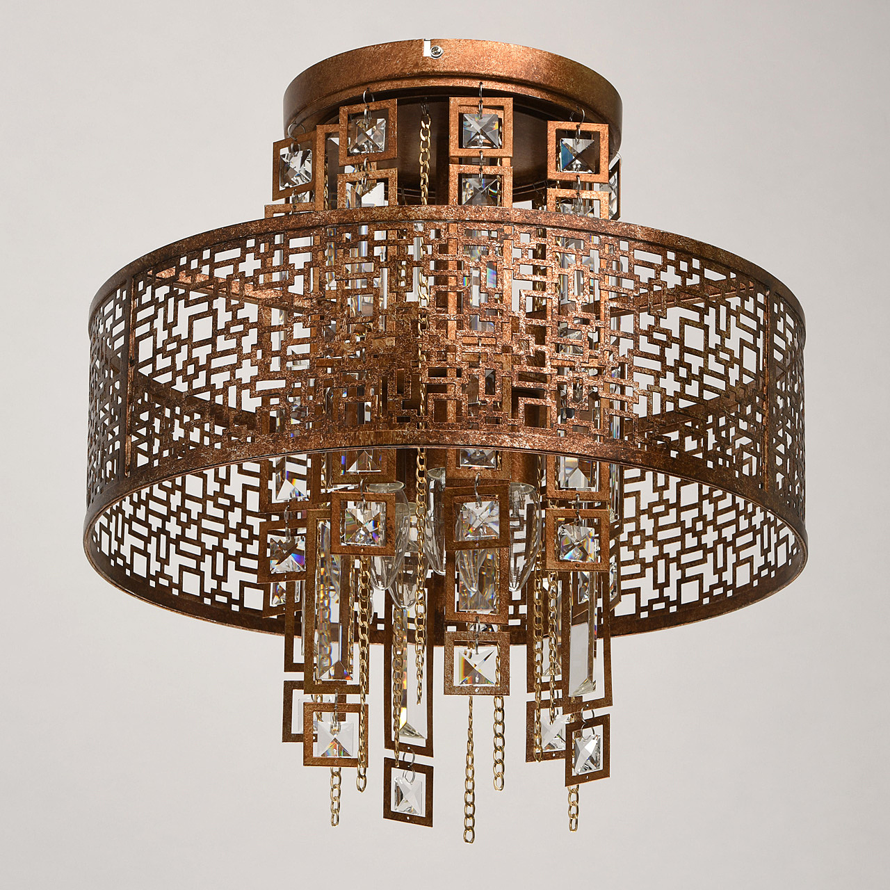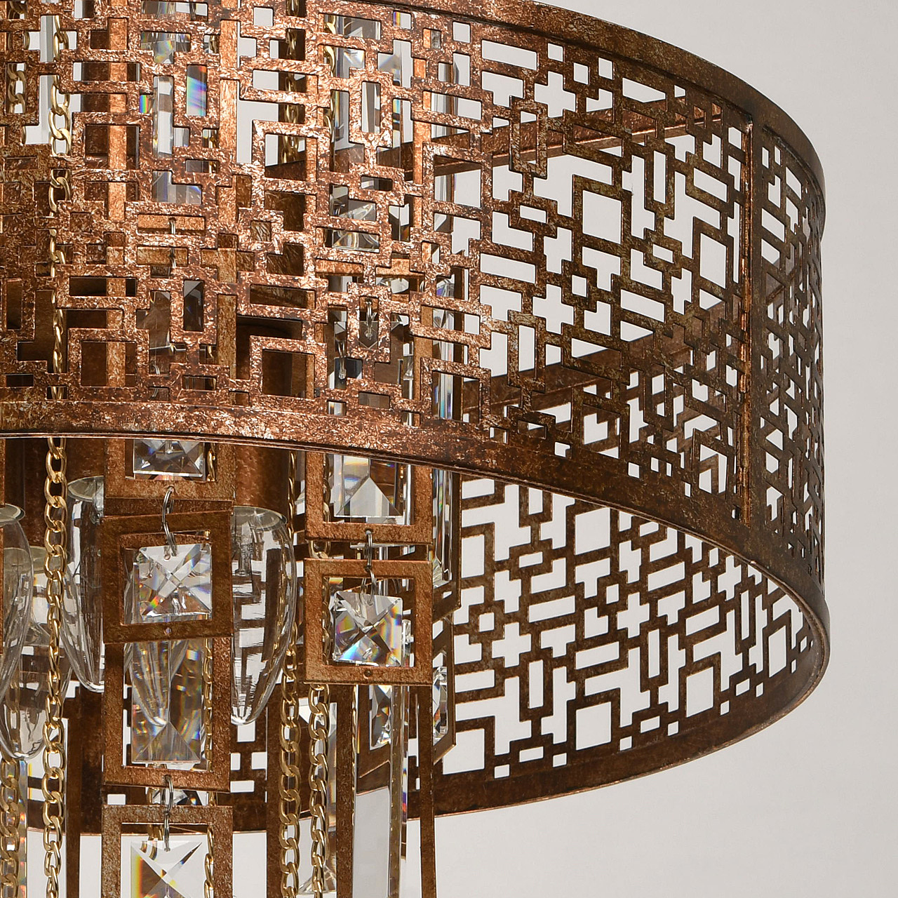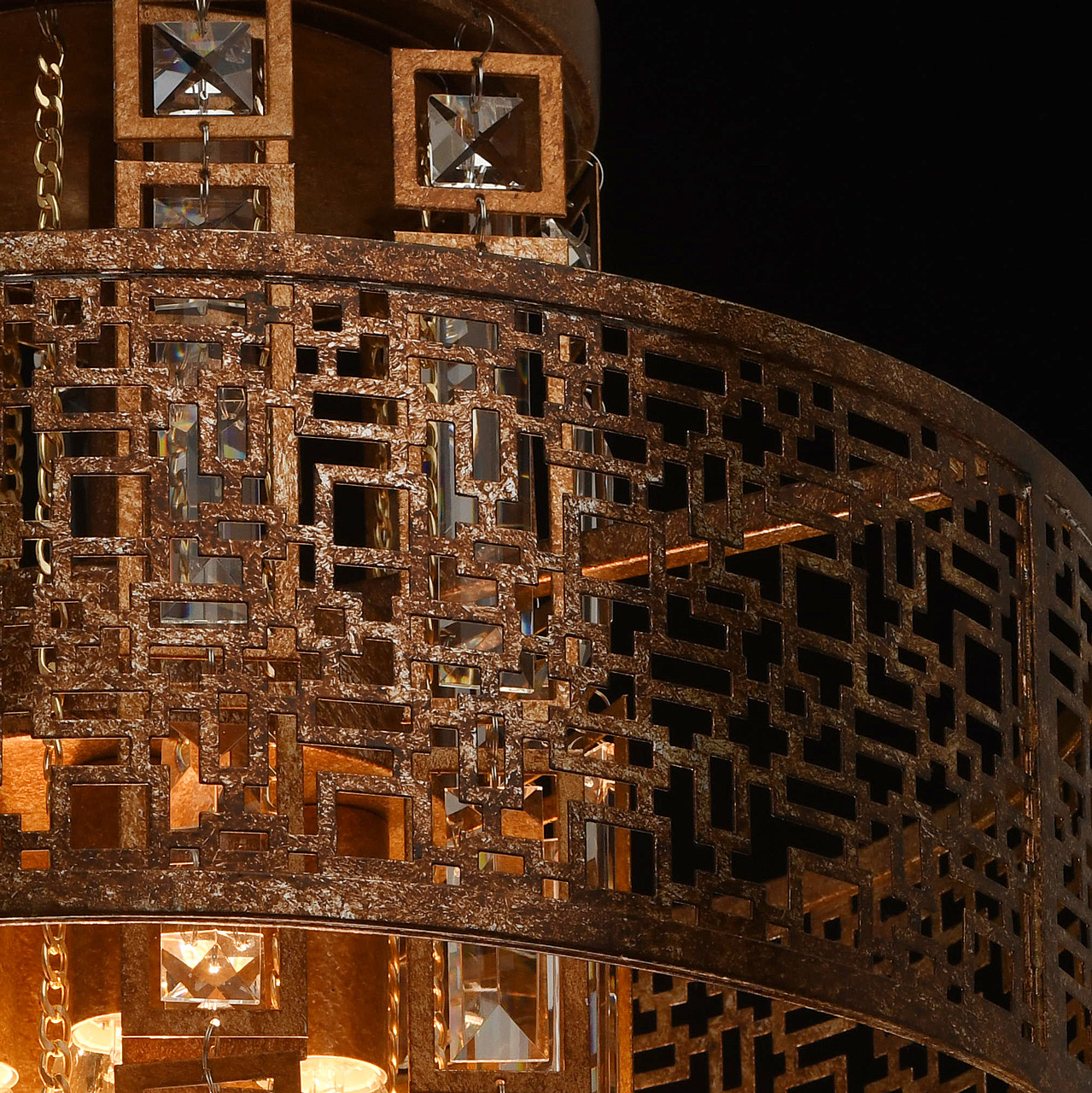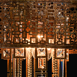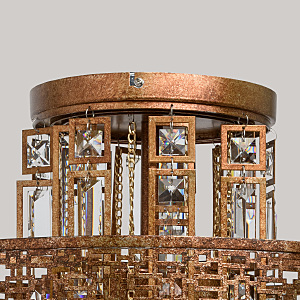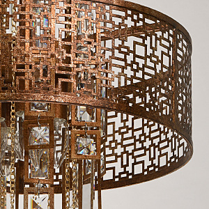 Традиционный узор Марокко выполнен в цвете коньячного дуба с эффектом благородной ржавчины. Ориентальная тональность коллекции станет находкой для ценителей этно, арт-деко, обладающих помещениями Loft и лаунж. Ручная технология окрашивания и крупный хрусталь при свете каждый раз будет преображаться по-разному, что добавляет исключительной привлекательности владельцу. Возможности крепления позволяют регулировать высоту подвеса к потолку. Сильные источники света сконцентрированы в центре светильника, широко отдавая рассеянный свет вовне. Семья дополнена потолочным светом в том же стиле.